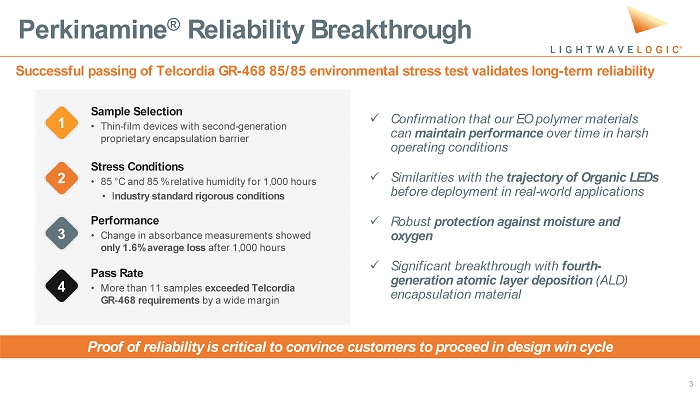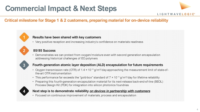 Perkinamine ® Reliability Breakthrough 3 Successful passing of Telcordia GR - 468 85/85 environmental stress test validates long - term reliability • Thin - film devices with second - generation proprietary encapsulation barrier Sample Selection 1 • 85 ௗƒ C and 85 ௗ % relative humidity for 1,000 hours • I ndustry standard rigorous conditions Stress Conditions 2 • Change in absorbance measurements showed only 1.6% average loss after 1,000 hours Performance 3 • More than 11 samples exceeded Telcordia GR - 468 requirements by a wide margin Pass Rate 4 Proof of reliability is critical to convince customers to proceed in design win cycle x Confirmation that our EO polymer materials can maintain performance over time in harsh operating conditions x Similarities with the trajectory of Organic LEDs before deployment in real - world applications x Robust protection against moisture and oxygen x Significant breakthrough with fourth - generation atomic layer deposition (ALD) encapsulation material