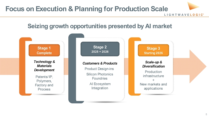• Very positive reception and increasing industry’s confidence on materials readiness Results have been shared with key customers 1 • Demonstrates we can protect from oxygen/moisture even with second generation encapsulation addressing historical challenges of EO polymers 85/85 Success 2 • Oxygen transmission rate (OTR) of 1.4 îௗ 10 ⁻⁶ ௗ g/m²/day - approaching the measurement limit of state - of - the - art OTR instrumentation • This performance far exceeds the "gold - box" standard of 7 îௗ 10 ⁻⁶ ௗ g/m²/day for lifetime reliability • Preparing this fourth - generation encapsulation material for its next - release back - end - of - line (BEOL) Process Design Kit (PDK) for integration into silicon photonics foundries Fourth - generation atomic layer deposition (ALD) encapsulation for future requirements 3 • Focused on continuous improvement of materials, process and encapsulation Next step is to demonstrate reliability on devices in partnership with customers 4 Commercial Impact & Next Steps 4 Critical milestone for Stage 1 & 2 customers, preparing material for on - device reliability