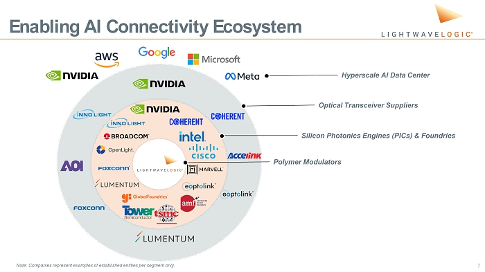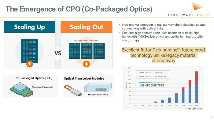 The Emergence of CPO (Co - Packaged Optics) 6 • New market emerging to replace very short electrical copper connections with optical links • Requires high density ports (size becomes critical), high bandwidth (400G+), low power and ability to integrate with silicon chips Excellent fit for Perkinamine ® ; future proof technology unlike legacy material alternatives