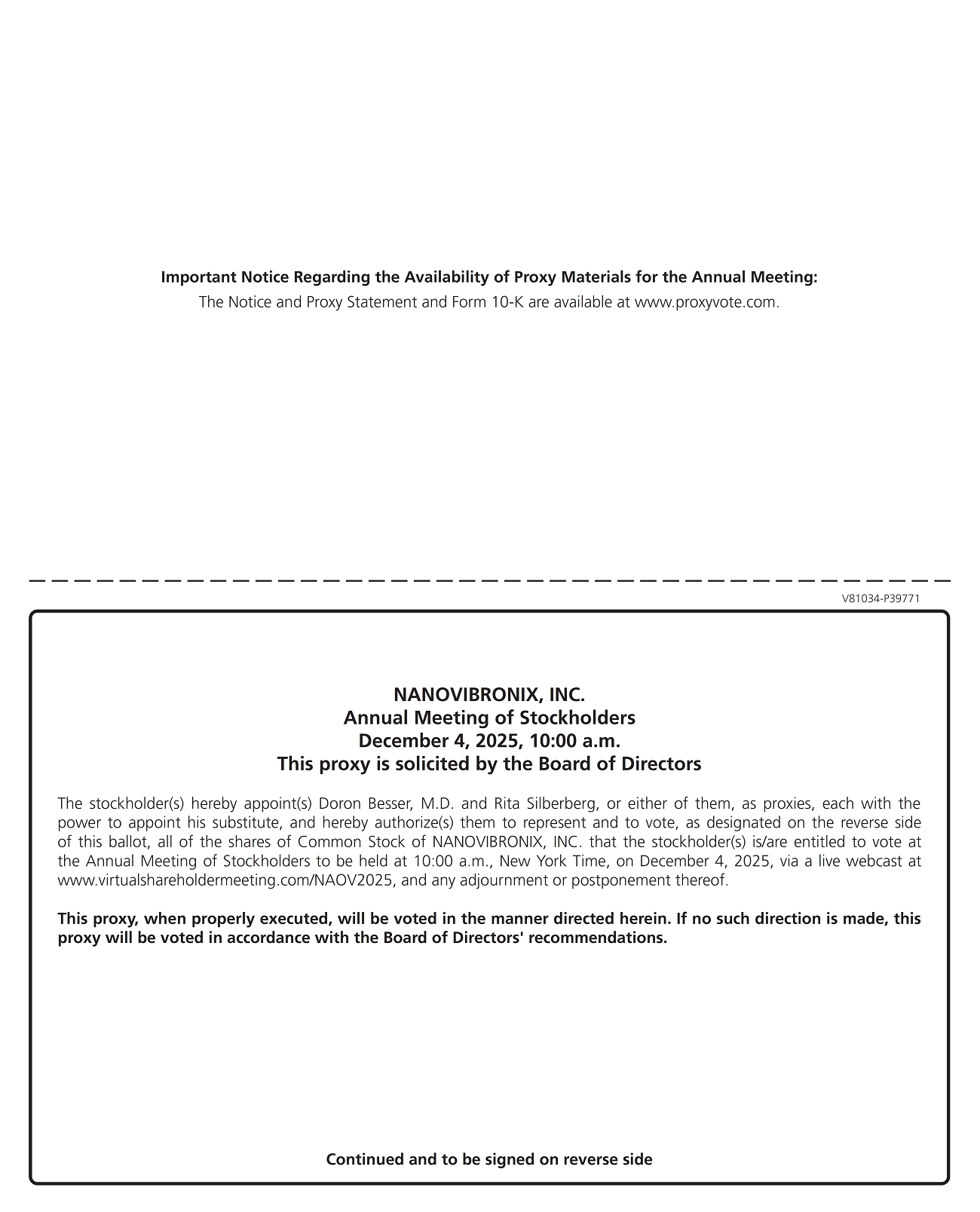 You are cordially invited to attend the 2025 Annual Meeting of Stockholders (the “Annual Meeting”) of NanoVibronix, Inc., a Delaware corporation (“we,” “us,” “our” or the “Company”), which will be held on December 4, 2025, at 10:00 a.m. Eastern Time at www.virtualshareholdermeeting.com/NAOV2025. To provide access to our stockholders regardless of geographic location, the Company has determined that the Annual Meeting will be a virtual meeting conducted exclusively via live webcast. You or your proxyholder will be able to attend the virtual Annual Meeting online, vote, and submit questions during the Annual Meeting by visiting www.virtualshareholdermeeting.com/NAOV2025 and entering the 16-digit control number included on the proxy card or voting instruction form, as applicable. To receive access to the virtual Annual Meeting, registered stockholders and beneficial stockholders (those holding shares through a stock brokerage account or by a bank or other holder of record) will need to follow the instructions applicable to them provided in the accompanying proxy statement. Details regarding the Annual Meeting and the business to be conducted at the Annual Meeting are more fully described in the accompanying Notice of Annual Stockholders Meeting and proxy statement. You are entitled to vote at our Annual Meeting and any adjournments, continuations or postponements thereof only if you were a stockholder as of October 27, 2025.