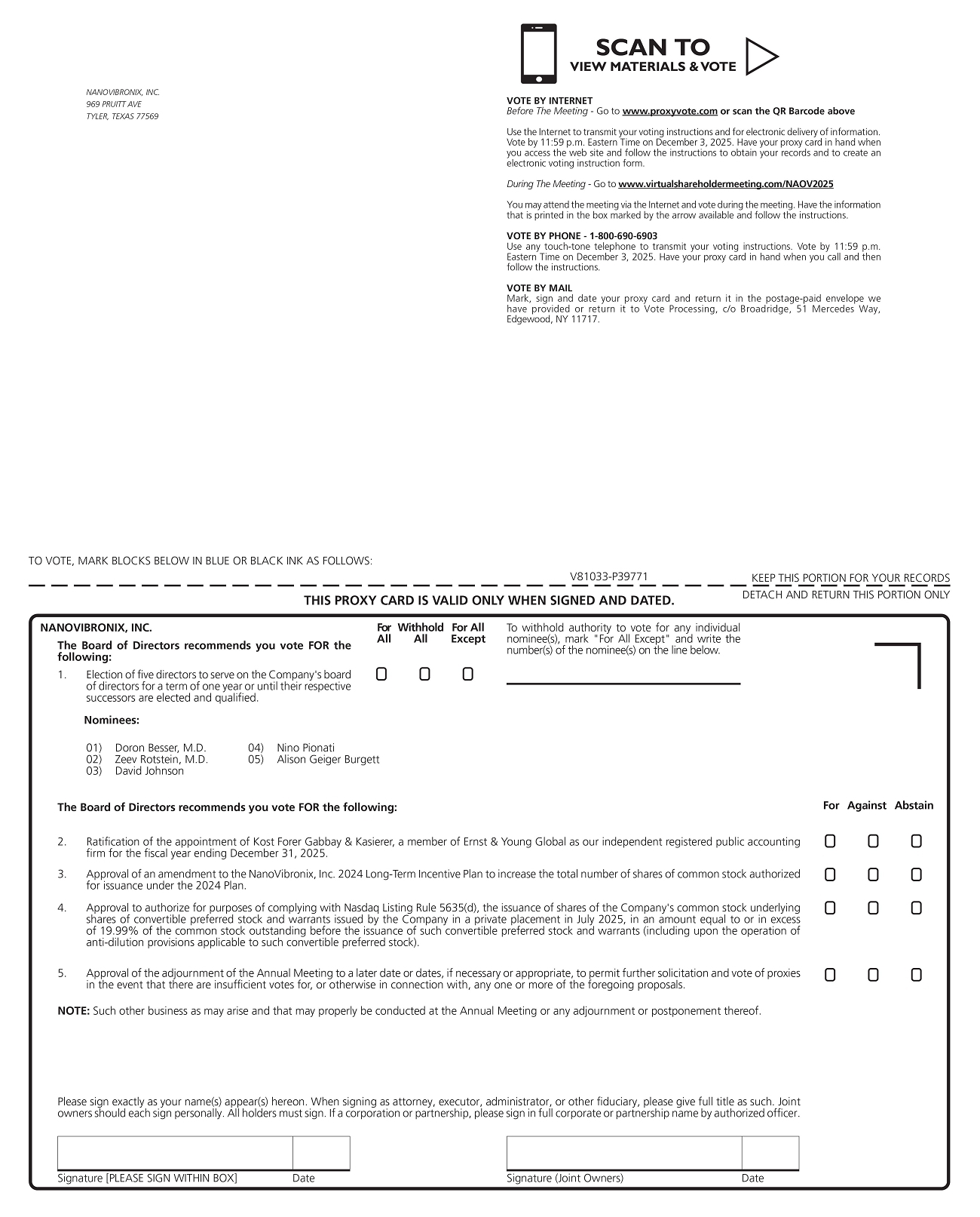 The Board has fixed the close of business on October 27, 2025, as the record date (the “Record Date”) for the Annual Meeting. Only stockholders of record of our common stock on the Record Date are entitled to receive notice of the Annual Meeting and vote at the Annual Meeting. A complete list of registered stockholders entitled to vote at the Annual Meeting will be available for inspection at the principal executive offices of the Company (upon request to us by mail at NanoVibronix, Inc., 969 Pruitt Place, Tyler TX 75703, Attn: Doron Besser, M.D., or by calling 914-233-3004 and asking for Doron Besser, M.D.) during regular business hours for the 10 calendar days prior to the Annual Meeting.