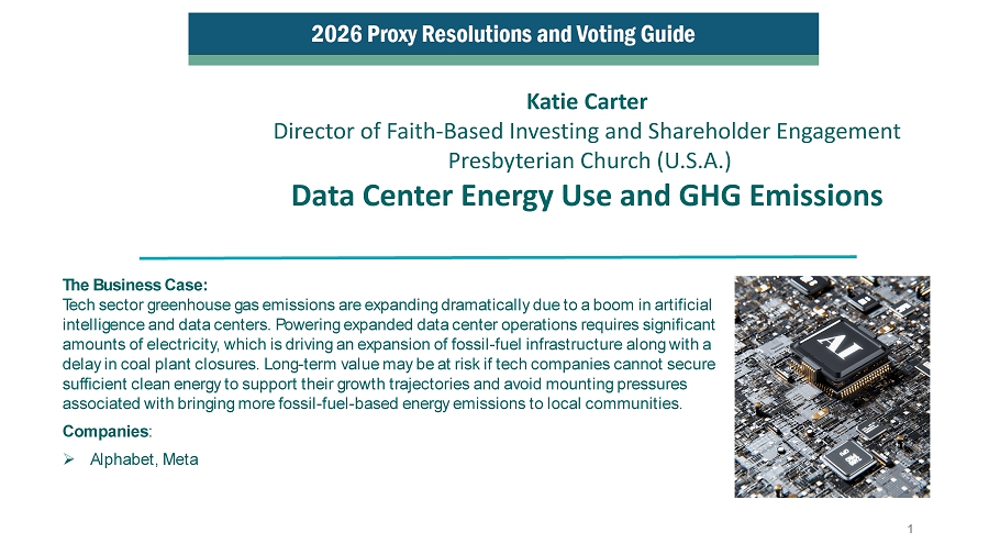 1 Katie Carter Director of Faith - Based Investing and Shareholder Engagement Presbyterian Church (U.S.A.) Data Center Energy Use and GHG Emissions The Business Case: Tech sector greenhouse gas emissions are expanding dramatically due to a boom in artificial intelligence and data centers. Powering expanded data center operations requires significant amounts of electricity, which is driving an expansion of fossil - fuel infrastructure along with a delay in coal plant closures. Long - term value may be at risk if tech companies cannot secure su ffi cient clean energy to support their growth trajectories and avoid mounting pressures associated with bringing more fossil - fuel - based energy emissions to local communities. Companies : » Alphabet, Meta