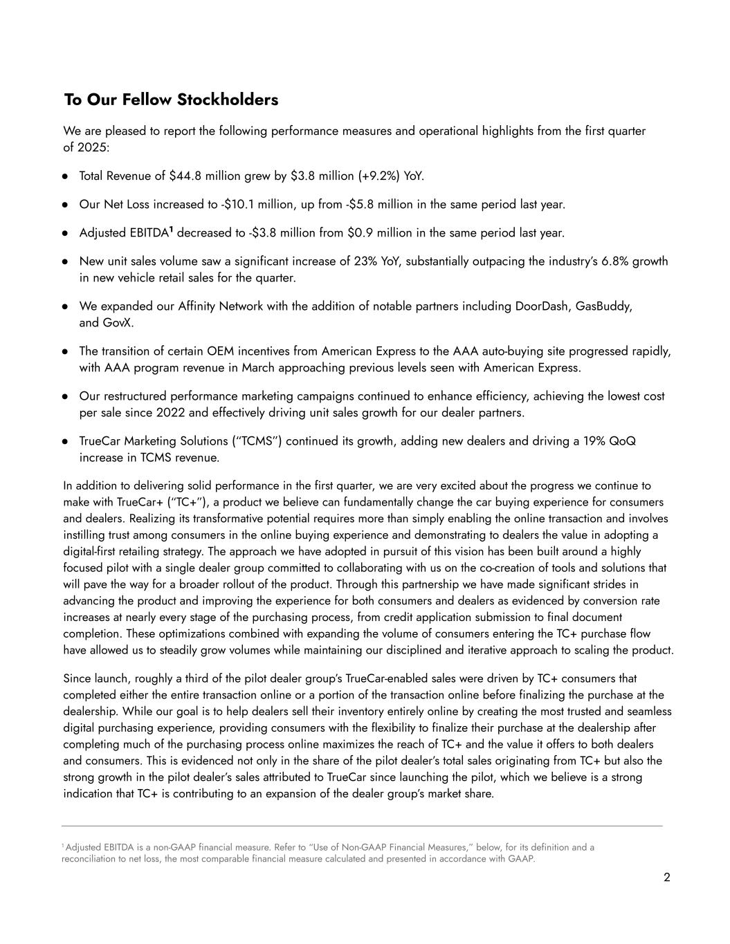 To Our Fellow Stockholders We are pleased to report the following performance measures and operational highlights from the first quarter of 2025: ● Total Revenue of $44.8 million grew by $3.8 million (+9.2%) YoY. ● Our Net Loss increased to -$10.1 million, up from -$5.8 million in the same period last year. ● Adjusted EBITDA1 decreased to -$3.8 million from $0.9 million in the same period last year. ● New unit sales volume saw a significant increase of 23% YoY, substantially outpacing the industry’s 6.8% growth in new vehicle retail sales for the quarter. ● We expanded our Affinity Network with the addition of notable partners including DoorDash, GasBuddy, and GovX. ● The transition of certain OEM incentives from American Express to the AAA auto-buying site progressed rapidly, with AAA program revenue in March approaching previous levels seen with American Express. ● Our restructured performance marketing campaigns continued to enhance efficiency, achieving the lowest cost per sale since 2022 and effectively driving unit sales growth for our dealer partners. ● TrueCar Marketing Solutions (“TCMS”) continued its growth, adding new dealers and driving a 19% QoQ increase in TCMS revenue. In addition to delivering solid performance in the first quarter, we are very excited about the progress we continue to make with TrueCar+ (“TC+”), a product we believe can fundamentally change the car buying experience for consumers and dealers. Realizing its transformative potential requires more than simply enabling the online transaction and involves instilling trust among consumers in the online buying experience and demonstrating to dealers the value in adopting a digital-first retailing strategy. The approach we have adopted in pursuit of this vision has been built around a highly focused pilot with a single dealer group committed to collaborating with us on the co-creation of tools and solutions that will pave the way for a broader rollout of the product. Through this partnership we have made significant strides in advancing the product and improving the experience for both consumers and dealers as evidenced by conversion rate increases at nearly every stage of the purchasing process, from credit application submission to final document completion. These optimizations combined with expanding the volume of consumers entering the TC+ purchase flow have allowed us to steadily grow volumes while maintaining our disciplined and iterative approach to scaling the product. Since launch, roughly a third of the pilot dealer group’s TrueCar-enabled sales were driven by TC+ consumers that completed either the entire transaction online or a portion of the transaction online before finalizing the purchase at the dealership. While our goal is to help dealers sell their inventory entirely online by creating the most trusted and seamless digital purchasing experience, providing consumers with the flexibility to finalize their purchase at the dealership after completing much of the purchasing process online maximizes the reach of TC+ and the value it offers to both dealers and consumers. This is evidenced not only in the share of the pilot dealer’s total sales originating from TC+ but also the strong growth in the pilot dealer’s sales attributed to TrueCar since launching the pilot, which we believe is a strong indication that TC+ is contributing to an expansion of the dealer group’s market share. 2 1 Adjusted EBITDA is a non-GAAP financial measure. Refer to “Use of Non-GAAP Financial Measures,” below, for its definition and a reconciliation to net loss, the most comparable financial measure calculated and presented in accordance with GAAP.