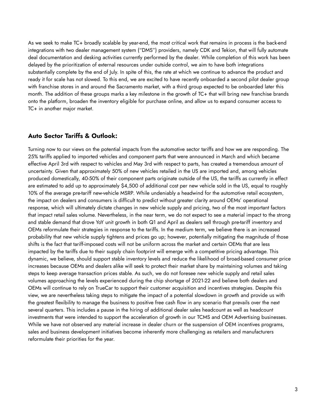 As we seek to make TC+ broadly scalable by year-end, the most critical work that remains in process is the back-end integrations with two dealer management system (“DMS”) providers, namely CDK and Tekion, that will fully automate deal documentation and desking activities currently performed by the dealer. While completion of this work has been delayed by the prioritization of external resources under outside control, we aim to have both integrations substantially complete by the end of July. In spite of this, the rate at which we continue to advance the product and ready it for scale has not slowed. To this end, we are excited to have recently onboarded a second pilot dealer group with franchise stores in and around the Sacramento market, with a third group expected to be onboarded later this month. The addition of these groups marks a key milestone in the growth of TC+ that will bring new franchise brands onto the platform, broaden the inventory eligible for purchase online, and allow us to expand consumer access to TC+ in another major market. Auto Sector Tariffs & Outlook: Turning now to our views on the potential impacts from the automotive sector tariffs and how we are responding. The 25% tariffs applied to imported vehicles and component parts that were announced in March and which became effective April 3rd with respect to vehicles and May 3rd with respect to parts, has created a tremendous amount of uncertainty. Given that approximately 50% of new vehicles retailed in the US are imported and, among vehicles produced domestically, 40-50% of their component parts originate outside of the US, the tariffs as currently in effect are estimated to add up to approximately $4,500 of additional cost per new vehicle sold in the US, equal to roughly 10% of the average pre-tariff new-vehicle MSRP. While undeniably a headwind for the automotive retail ecosystem, the impact on dealers and consumers is difficult to predict without greater clarity around OEMs’ operational response, which will ultimately dictate changes in new vehicle supply and pricing, two of the most important factors that impact retail sales volume. Nevertheless, in the near term, we do not expect to see a material impact to the strong and stable demand that drove YoY unit growth in both Q1 and April as dealers sell through pre-tariff inventory and OEMs reformulate their strategies in response to the tariffs. In the medium term, we believe there is an increased probability that new vehicle supply tightens and prices go up; however, potentially mitigating the magnitude of those shifts is the fact that tariff-imposed costs will not be uniform across the market and certain OEMs that are less impacted by the tariffs due to their supply chain footprint will emerge with a competitive pricing advantage. This dynamic, we believe, should support stable inventory levels and reduce the likelihood of broad-based consumer price increases because OEMs and dealers alike will seek to protect their market share by maintaining volumes and taking steps to keep average transaction prices stable. As such, we do not foresee new vehicle supply and retail sales volumes approaching the levels experienced during the chip shortage of 2021-22 and believe both dealers and OEMs will continue to rely on TrueCar to support their customer acquisition and incentives strategies. Despite this view, we are nevertheless taking steps to mitigate the impact of a potential slowdown in growth and provide us with the greatest flexibility to manage the business to positive free cash flow in any scenario that prevails over the next several quarters. This includes a pause in the hiring of additional dealer sales headcount as well as headcount investments that were intended to support the acceleration of growth in our TCMS and OEM Advertising businesses. While we have not observed any material increase in dealer churn or the suspension of OEM incentives programs, sales and business development initiatives become inherently more challenging as retailers and manufacturers reformulate their priorities for the year. 3