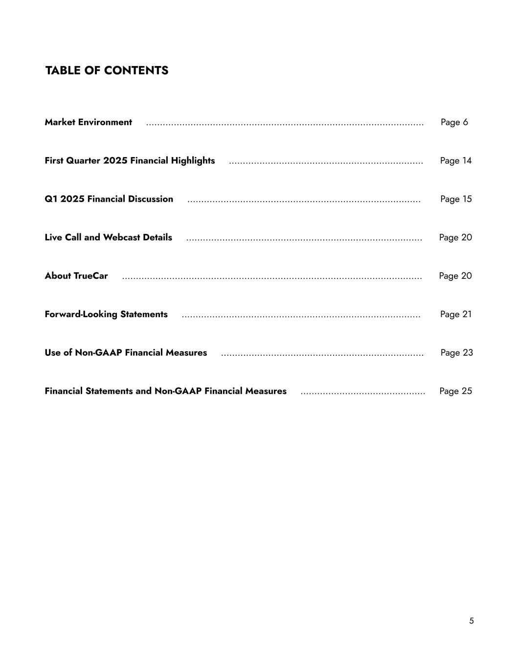 TABLE OF CONTENTS Market Environment ……………………………………………..……………………………………..… Page 6 First Quarter 2025 Financial Highlights …………………….…………….……………………….. Page 14 Q1 2025 Financial Discussion …………………………………………………….………..…..……. Page 15 Live Call and Webcast Details ……………….………………………………………….…………..… Page 20 About TrueCar …………………………………………………………………………………...….…..… Page 20 Forward-Looking Statements …………………………………………….……….…………………… Page 21 Use of Non-GAAP Financial Measures ………………………………………….….……………..… Page 23 Financial Statements and Non-GAAP Financial Measures ……………………………..………. Page 25 5