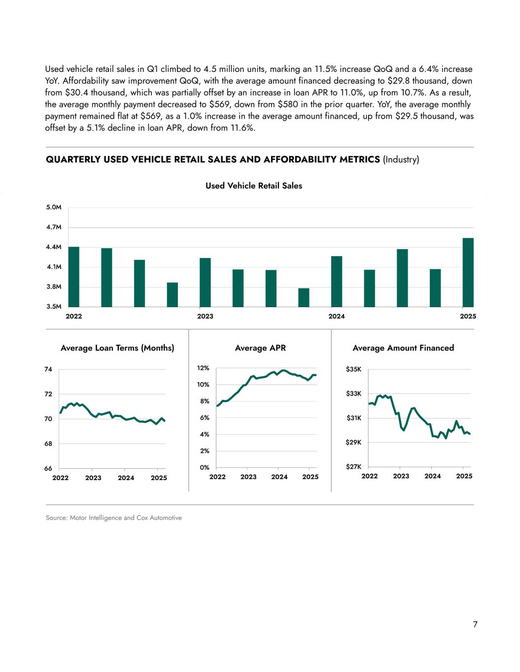 MARKET ENVIRONMENT Vehicle Sales Volumes New vehicle retail sales totaled 3.4 million units in Q1 2025 --- a 6.8% increase YoY and a 9.9% decline QoQ -- surpassing pre-pandemic levels (Q1 2019: 3.2 million units sold). New vehicle retail sales showed notable strength in March, likely driven by consumer demand ahead of expected tariff-related price increases. Sales surged 11% YoY in March, compared to 2% in February, and 6% in January. The average APR for new vehicle loans increased to 6.9% in Q1, up from 6.6% in Q4 2024. Despite the rise in interest rates, a 2.0% decline in the average list price to $47.3 thousand along with an extension in the average loan term from 68.0 to 68.9 months helped lower the average monthly payment to $788, down from $824 in the prior quarter. YoY, the average APR declined from 7.1% and the average list price decreased from $48.0 thousand. However, the amount financed increased 2.1% to $43.4 thousand, up from $42.5 thousand, making the average monthly payment $770 in Q1 2024. 6Source: Motor Intelligence and Cox Automotive QUARTERLY NEW VEHICLE RETAIL SALES AND AFFORDABILITY METRICS (Industry) New Vehicle Retail Sales Average Loan Terms (Months) Average APR Average Amount Financed