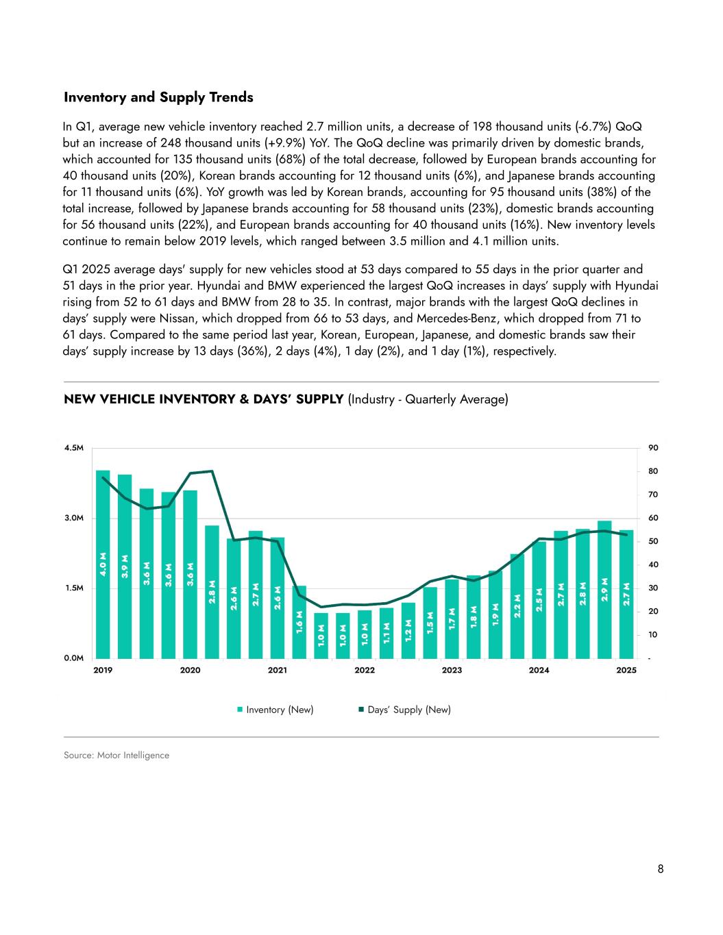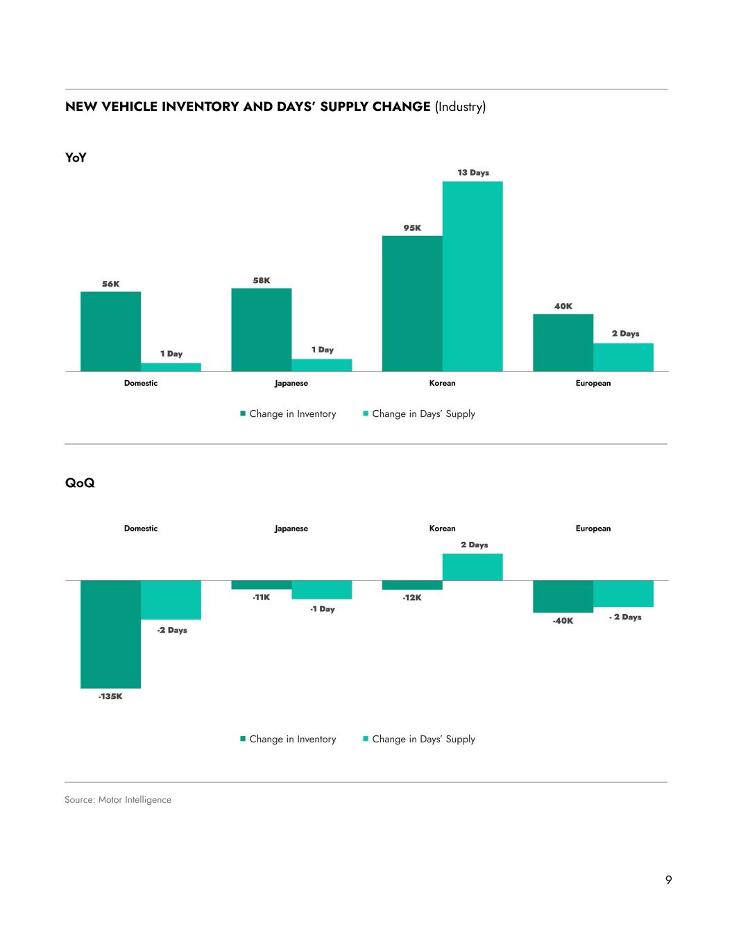 8 Inventory and Supply Trends In Q1, average new vehicle inventory reached 2.7 million units, a decrease of 198 thousand units (-6.7%) QoQ but an increase of 248 thousand units (+9.9%) YoY. The QoQ decline was primarily driven by domestic brands, which accounted for 135 thousand units (68%) of the total decrease, followed by European brands accounting for 40 thousand units (20%), Korean brands accounting for 12 thousand units (6%), and Japanese brands accounting for 11 thousand units (6%). YoY growth was led by Korean brands, accounting for 95 thousand units (38%) of the total increase, followed by Japanese brands accounting for 58 thousand units (23%), domestic brands accounting for 56 thousand units (22%), and European brands accounting for 40 thousand units (16%). New inventory levels continue to remain below 2019 levels, which ranged between 3.5 million and 4.1 million units. Q1 2025 average days' supply for new vehicles stood at 53 days compared to 55 days in the prior quarter and 51 days in the prior year. Hyundai and BMW experienced the largest QoQ increases in days’ supply with Hyundai rising from 52 to 61 days and BMW from 28 to 35. In contrast, major brands with the largest QoQ declines in days’ supply were Nissan, which dropped from 66 to 53 days, and Mercedes-Benz, which dropped from 71 to 61 days. Compared to the same period last year, Korean, European, Japanese, and domestic brands saw their days’ supply increase by 13 days (36%), 2 days (4%), 1 day (2%), and 1 day (1%), respectively. Source: Motor Intelligence NEW VEHICLE INVENTORY & DAYS’ SUPPLY (Industry - Quarterly Average) Days’ Supply (New)Inventory (New)