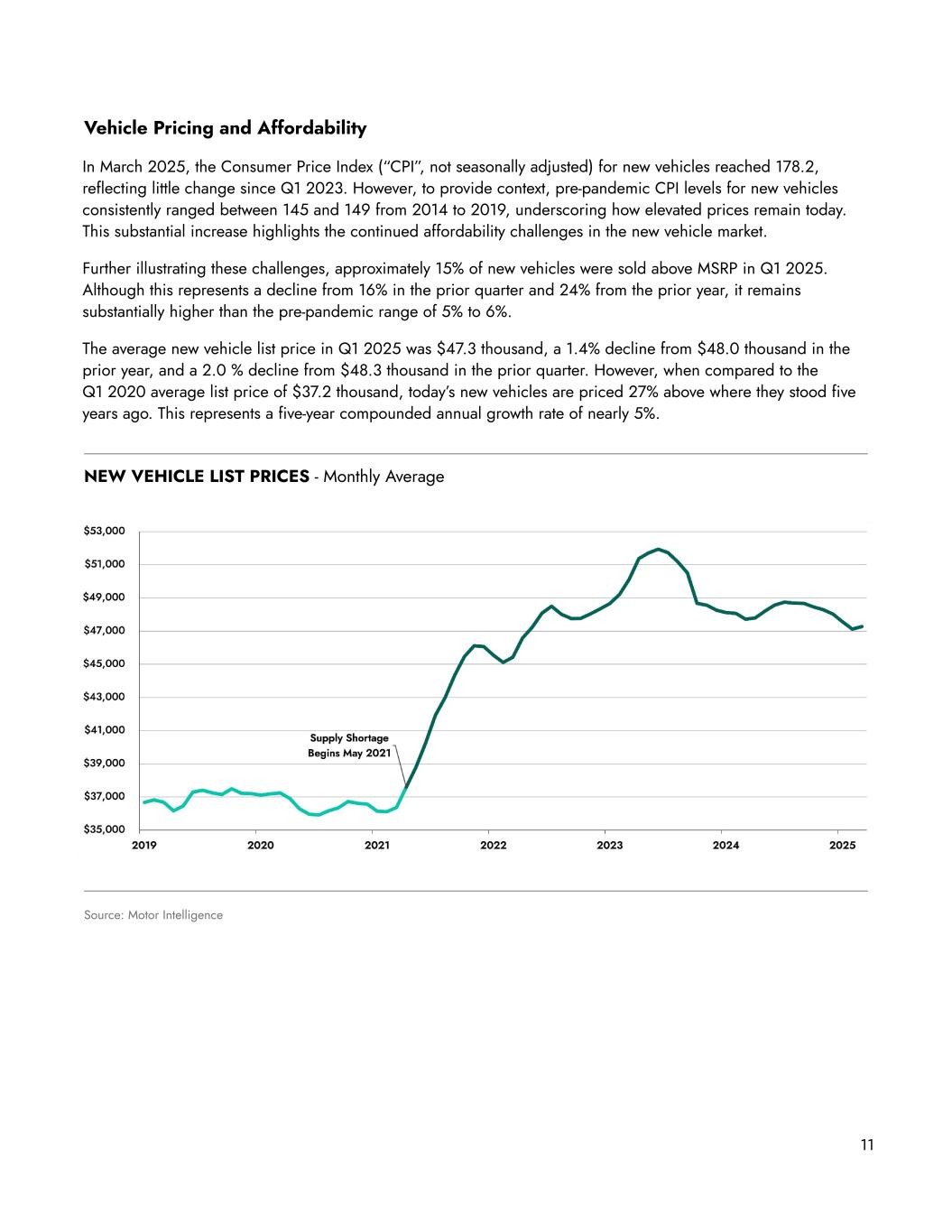 Source: Motor Intelligence NEW VEHICLE LIST PRICES - Monthly Average 11 Vehicle Pricing and Affordability In March 2025, the Consumer Price Index (“CPI”, not seasonally adjusted) for new vehicles reached 178.2, reflecting little change since Q1 2023. However, to provide context, pre-pandemic CPI levels for new vehicles consistently ranged between 145 and 149 from 2014 to 2019, underscoring how elevated prices remain today. This substantial increase highlights the continued affordability challenges in the new vehicle market. Further illustrating these challenges, approximately 15% of new vehicles were sold above MSRP in Q1 2025. Although this represents a decline from 16% in the prior quarter and 24% from the prior year, it remains substantially higher than the pre-pandemic range of 5% to 6%. The average new vehicle list price in Q1 2025 was $47.3 thousand, a 1.4% decline from $48.0 thousand in the prior year, and a 2.0 % decline from $48.3 thousand in the prior quarter. However, when compared to the Q1 2020 average list price of $37.2 thousand, today’s new vehicles are priced 27% above where they stood five years ago. This represents a five-year compounded annual growth rate of nearly 5%.