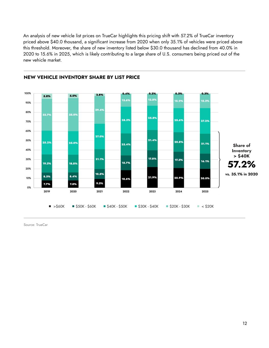 An analysis of new vehicle list prices on TrueCar highlights this pricing shift with 57.2% of TrueCar inventory priced above $40.0 thousand, a significant increase from 2020 when only 35.1% of vehicles were priced above this threshold. Moreover, the share of new inventory listed below $30.0 thousand has declined from 40.0% in 2020 to 15.6% in 2025, which is likely contributing to a large share of U.S. consumers being priced out of the new vehicle market. Source: TrueCar NEW VEHICLE INVENTORY SHARE BY LIST PRICE >$60K $50K - $60K $40K - $50K $30K - $40K $20K - $30K < $20K Share of Inventory > $40K 57.2% vs. 35.1% in 2020 12