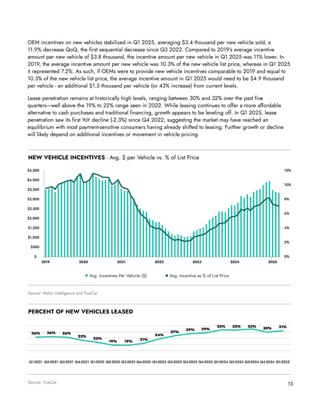 OEM incentives on new vehicles stabilized in Q1 2025, averaging $3.4 thousand per new vehicle sold, a 11.9% decrease QoQ, the first sequential decrease since Q3 2022. Compared to 2019’s average incentive amount per new vehicle of $3.8 thousand, the incentive amount per new vehicle in Q1 2025 was 11% lower. In 2019, the average incentive amount per new vehicle was 10.3% of the new vehicle list price, whereas in Q1 2025 it represented 7.2%. As such, if OEMs were to provide new vehicle incentives comparable to 2019 and equal to 10.3% of the new vehicle list price, the average incentive amount in Q1 2025 would need to be $4.9 thousand per vehicle - an additional $1.5 thousand per vehicle (or 43% increase) from current levels. Lease penetration remains at historically high levels, ranging between 30% and 32% over the past five quarters—well above the 19% to 22% range seen in 2022. While leasing continues to offer a more affordable alternative to cash purchases and traditional financing, growth appears to be leveling off. In Q1 2025, lease penetration saw its first YoY decline (-2.3%) since Q4 2022, suggesting the market may have reached an equilibrium with most payment-sensitive consumers having already shifted to leasing. Further growth or decline will likely depend on additional incentives or movement in vehicle pricing. Source: Motor Intelligence and TrueCar NEW VEHICLE INCENTIVES - Avg. $ per Vehicle vs. % of List Price Avg. Incentive as % of List Price 13 Avg. Incentives Per Vehicle ($) PERCENT OF NEW VEHICLES LEASED Source: TrueCar