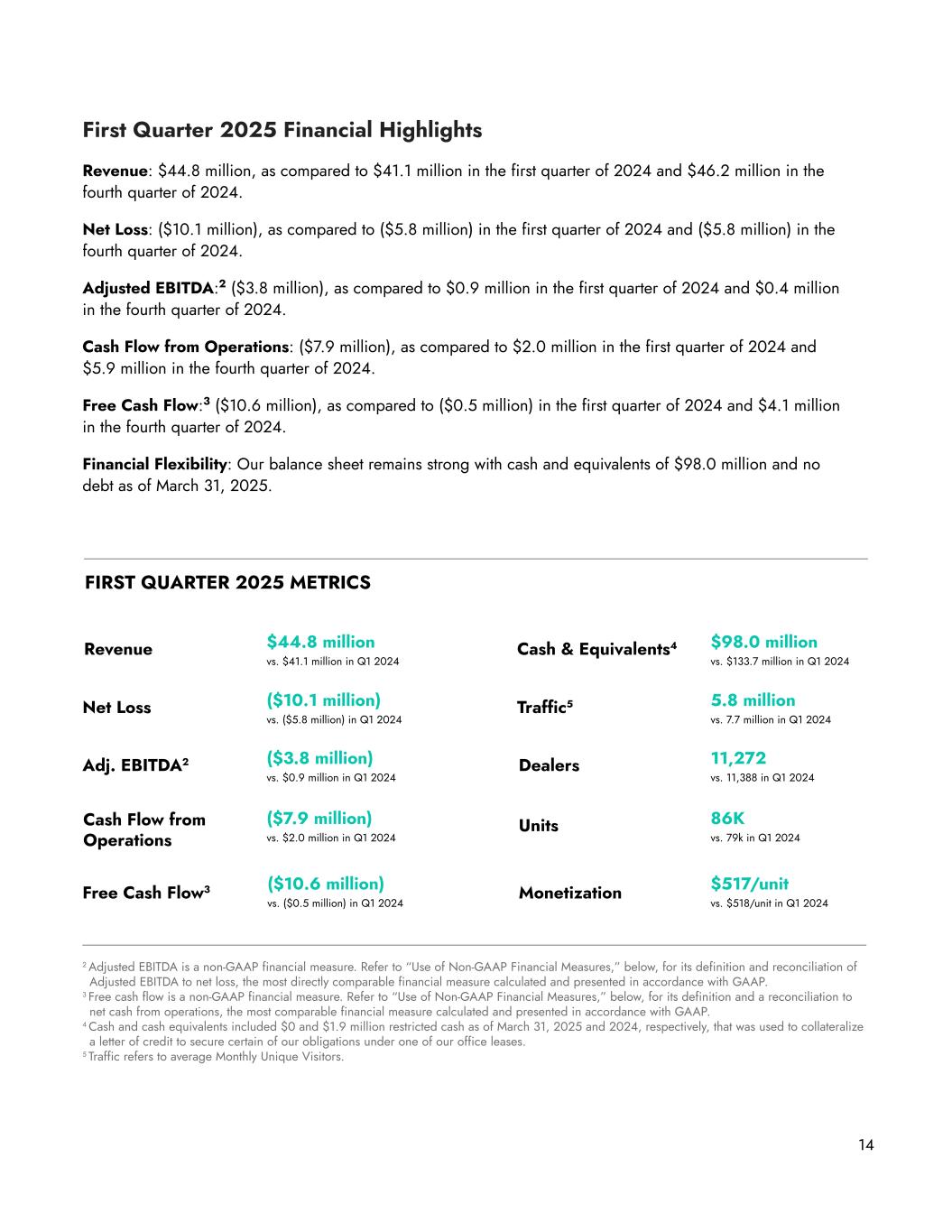 First Quarter 2025 Financial Highlights Revenue: $44.8 million, as compared to $41.1 million in the first quarter of 2024 and $46.2 million in the fourth quarter of 2024. Net Loss: ($10.1 million), as compared to ($5.8 million) in the first quarter of 2024 and ($5.8 million) in the fourth quarter of 2024. Adjusted EBITDA:2 ($3.8 million), as compared to $0.9 million in the first quarter of 2024 and $0.4 million in the fourth quarter of 2024. Cash Flow from Operations: ($7.9 million), as compared to $2.0 million in the first quarter of 2024 and $5.9 million in the fourth quarter of 2024. Free Cash Flow:3 ($10.6 million), as compared to ($0.5 million) in the first quarter of 2024 and $4.1 million in the fourth quarter of 2024. Financial Flexibility: Our balance sheet remains strong with cash and equivalents of $98.0 million and no debt as of March 31, 2025. Revenue $44.8 million vs. $41.1 million in Q1 2024 Dealers 11,272 vs. 11,388 in Q1 2024 Net Loss ($10.1 million) vs. ($5.8 million) in Q1 2024 Units 86K vs. 79k in Q1 2024 Adj. EBITDA2 ($3.8 million) vs. $0.9 million in Q1 2024 Monetization $517/unit vs. $518/unit in Q1 2024 2 Adjusted EBITDA is a non-GAAP financial measure. Refer to “Use of Non-GAAP Financial Measures,” below, for its definition and reconciliation of Adjusted EBITDA to net loss, the most directly comparable financial measure calculated and presented in accordance with GAAP. 3 Free cash flow is a non-GAAP financial measure. Refer to “Use of Non-GAAP Financial Measures,” below, for its definition and a reconciliation to net cash from operations, the most comparable financial measure calculated and presented in accordance with GAAP. 4 Cash and cash equivalents included $0 and $1.9 million restricted cash as of March 31, 2025 and 2024, respectively, that was used to collateralize a letter of credit to secure certain of our obligations under one of our office leases. 5 Traffic refers to average Monthly Unique Visitors. FIRST QUARTER 2025 METRICS 14 Traffic5 5.8 million vs. 7.7 million in Q1 2024 Free Cash Flow3 ($7.9 million) vs. $2.0 million in Q1 2024 Cash Flow from Operations ($10.6 million) vs. ($0.5 million) in Q1 2024 Cash & Equivalents4 $98.0 million vs. $133.7 million in Q1 2024