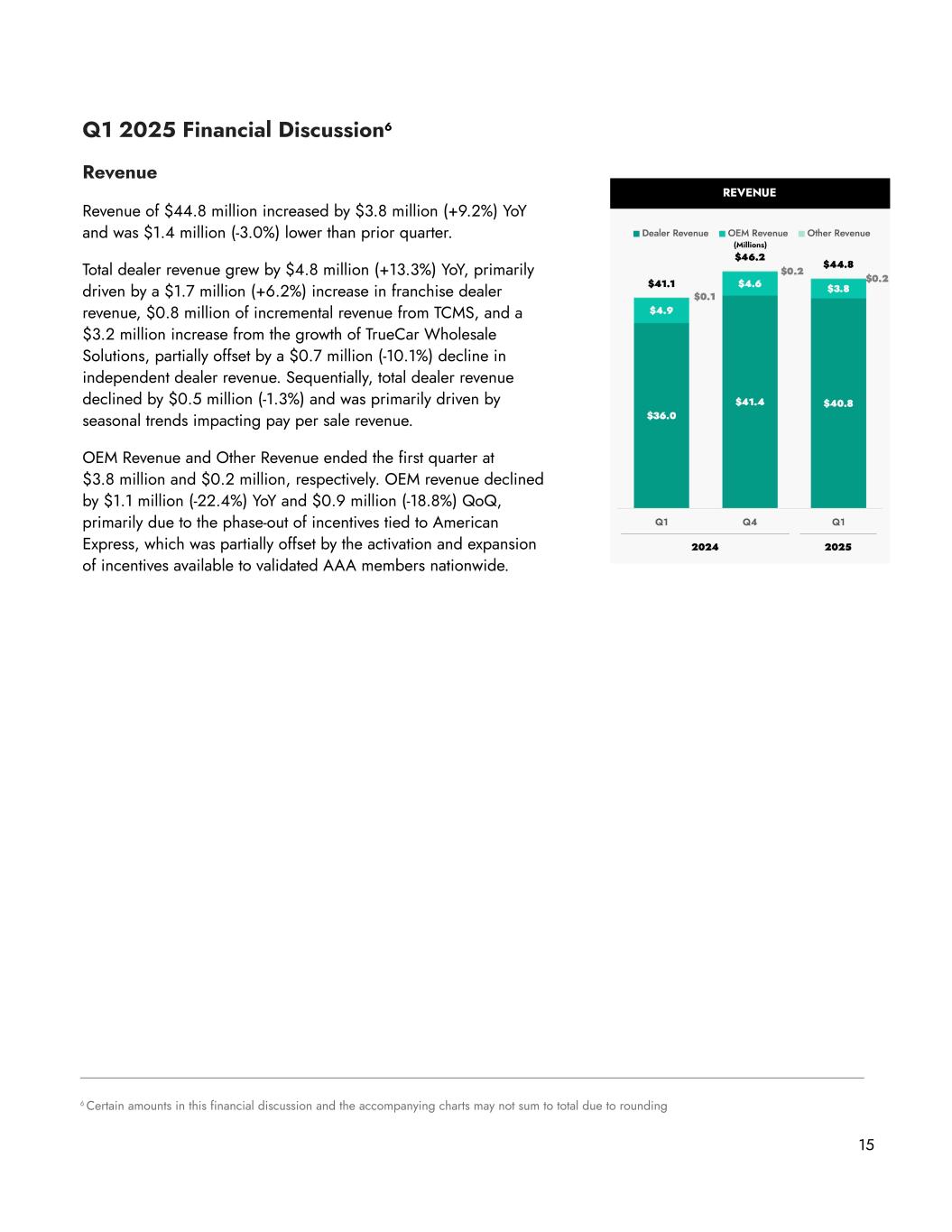 Q1 2025 Financial Discussion6 Revenue Revenue of $44.8 million increased by $3.8 million (+9.2%) YoY and was $1.4 million (-3.0%) lower than prior quarter. Total dealer revenue grew by $4.8 million (+13.3%) YoY, primarily driven by a $1.7 million (+6.2%) increase in franchise dealer revenue, $0.8 million of incremental revenue from TCMS, and a $3.2 million increase from the growth of TrueCar Wholesale Solutions, partially offset by a $0.7 million (-10.1%) decline in independent dealer revenue. Sequentially, total dealer revenue declined by $0.5 million (-1.3%) and was primarily driven by seasonal trends impacting pay per sale revenue. OEM Revenue and Other Revenue ended the first quarter at $3.8 million and $0.2 million, respectively. OEM revenue declined by $1.1 million (-22.4%) YoY and $0.9 million (-18.8%) QoQ, primarily due to the phase-out of incentives tied to American Express, which was partially offset by the activation and expansion of incentives available to validated AAA members nationwide. 15 (Millions) 6 Certain amounts in this financial discussion and the accompanying charts may not sum to total due to rounding
