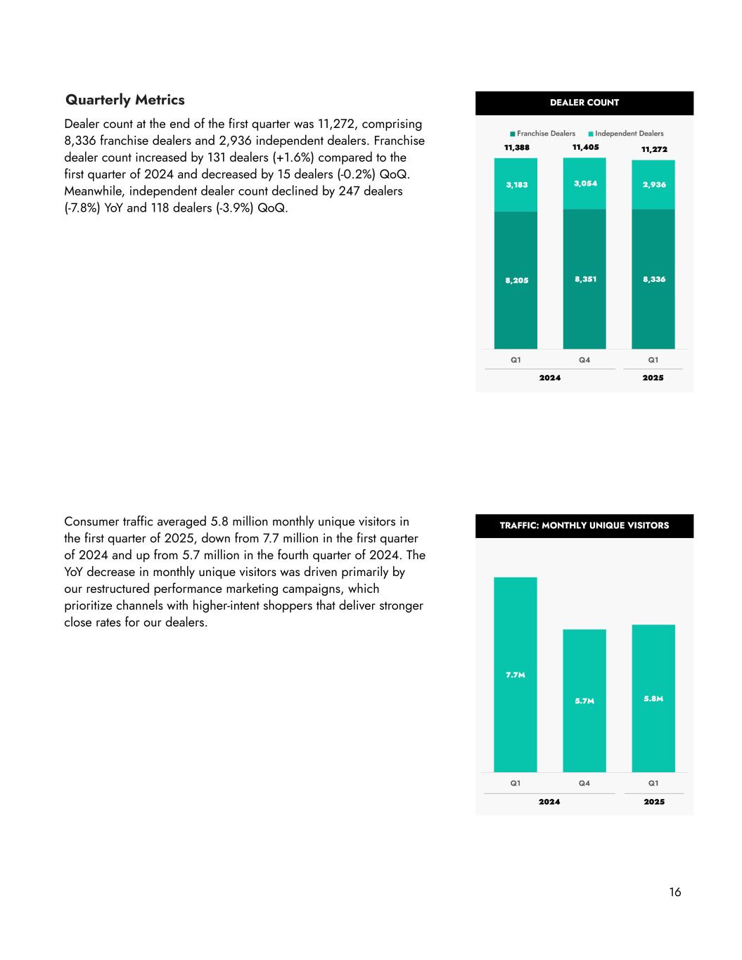 Quarterly Metrics Dealer count at the end of the first quarter was 11,272, comprising 8,336 franchise dealers and 2,936 independent dealers. Franchise dealer count increased by 131 dealers (+1.6%) compared to the first quarter of 2024 and decreased by 15 dealers (-0.2%) QoQ. Meanwhile, independent dealer count declined by 247 dealers (-7.8%) YoY and 118 dealers (-3.9%) QoQ. Consumer traffic averaged 5.8 million monthly unique visitors in the first quarter of 2025, down from 7.7 million in the first quarter of 2024 and up from 5.7 million in the fourth quarter of 2024. The YoY decrease in monthly unique visitors was driven primarily by our restructured performance marketing campaigns, which prioritize channels with higher-intent shoppers that deliver stronger close rates for our dealers. 16