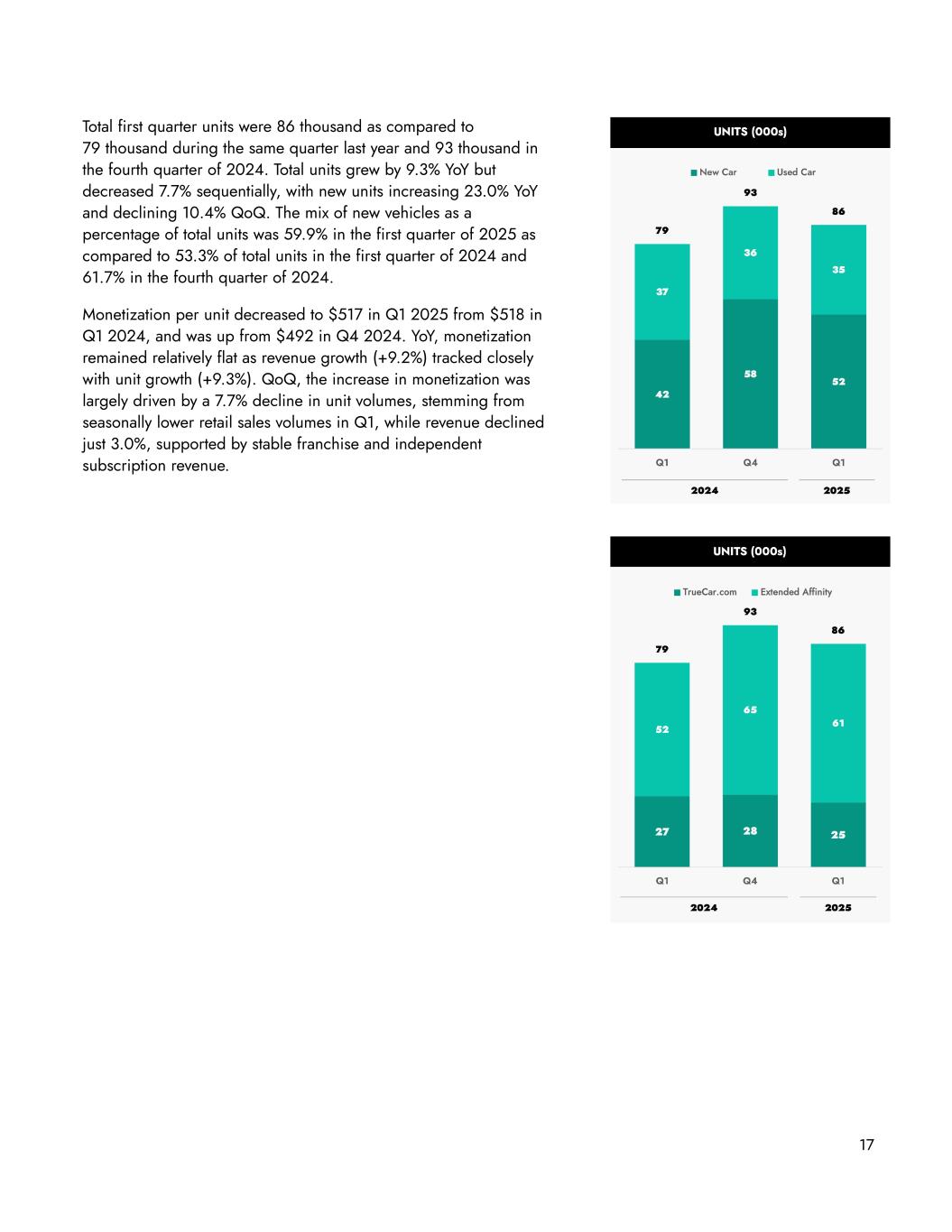 Total first quarter units were 86 thousand as compared to 79 thousand during the same quarter last year and 93 thousand in the fourth quarter of 2024. Total units grew by 9.3% YoY but decreased 7.7% sequentially, with new units increasing 23.0% YoY and declining 10.4% QoQ. The mix of new vehicles as a percentage of total units was 59.9% in the first quarter of 2025 as compared to 53.3% of total units in the first quarter of 2024 and 61.7% in the fourth quarter of 2024. Monetization per unit decreased to $517 in Q1 2025 from $518 in Q1 2024, and was up from $492 in Q4 2024. YoY, monetization remained relatively flat as revenue growth (+9.2%) tracked closely with unit growth (+9.3%). QoQ, the increase in monetization was largely driven by a 7.7% decline in unit volumes, stemming from seasonally lower retail sales volumes in Q1, while revenue declined just 3.0%, supported by stable franchise and independent subscription revenue. 17