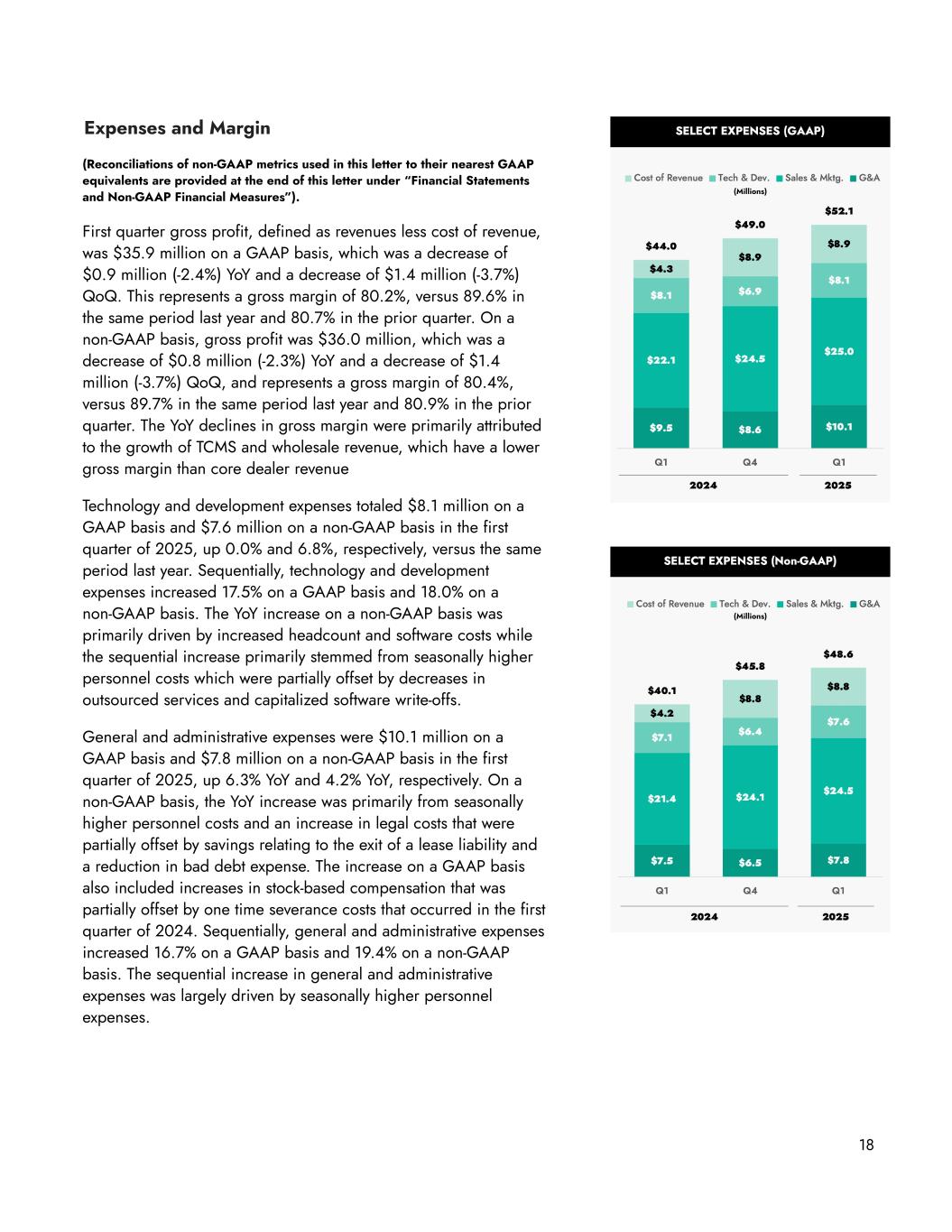 Expenses and Margin (Reconciliations of non-GAAP metrics used in this letter to their nearest GAAP equivalents are provided at the end of this letter under “Financial Statements and Non-GAAP Financial Measures”). First quarter gross profit, defined as revenues less cost of revenue, was $35.9 million on a GAAP basis, which was a decrease of $0.9 million (-2.4%) YoY and a decrease of $1.4 million (-3.7%) QoQ. This represents a gross margin of 80.2%, versus 89.6% in the same period last year and 80.7% in the prior quarter. On a non-GAAP basis, gross profit was $36.0 million, which was a decrease of $0.8 million (-2.3%) YoY and a decrease of $1.4 million (-3.7%) QoQ, and represents a gross margin of 80.4%, versus 89.7% in the same period last year and 80.9% in the prior quarter. The YoY declines in gross margin were primarily attributed to the growth of TCMS and wholesale revenue, which have a lower gross margin than core dealer revenue Technology and development expenses totaled $8.1 million on a GAAP basis and $7.6 million on a non-GAAP basis in the first quarter of 2025, up 0.0% and 6.8%, respectively, versus the same period last year. Sequentially, technology and development expenses increased 17.5% on a GAAP basis and 18.0% on a non-GAAP basis. The YoY increase on a non-GAAP basis was primarily driven by increased headcount and software costs while the sequential increase primarily stemmed from seasonally higher personnel costs which were partially offset by decreases in outsourced services and capitalized software write-offs. General and administrative expenses were $10.1 million on a GAAP basis and $7.8 million on a non-GAAP basis in the first quarter of 2025, up 6.3% YoY and 4.2% YoY, respectively. On a non-GAAP basis, the YoY increase was primarily from seasonally higher personnel costs and an increase in legal costs that were partially offset by savings relating to the exit of a lease liability and a reduction in bad debt expense. The increase on a GAAP basis also included increases in stock-based compensation that was partially offset by one time severance costs that occurred in the first quarter of 2024. Sequentially, general and administrative expenses increased 16.7% on a GAAP basis and 19.4% on a non-GAAP basis. The sequential increase in general and administrative expenses was largely driven by seasonally higher personnel expenses. 18 (Millions) (Millions)