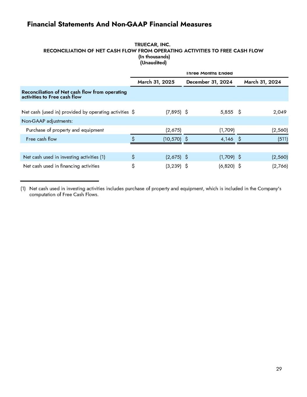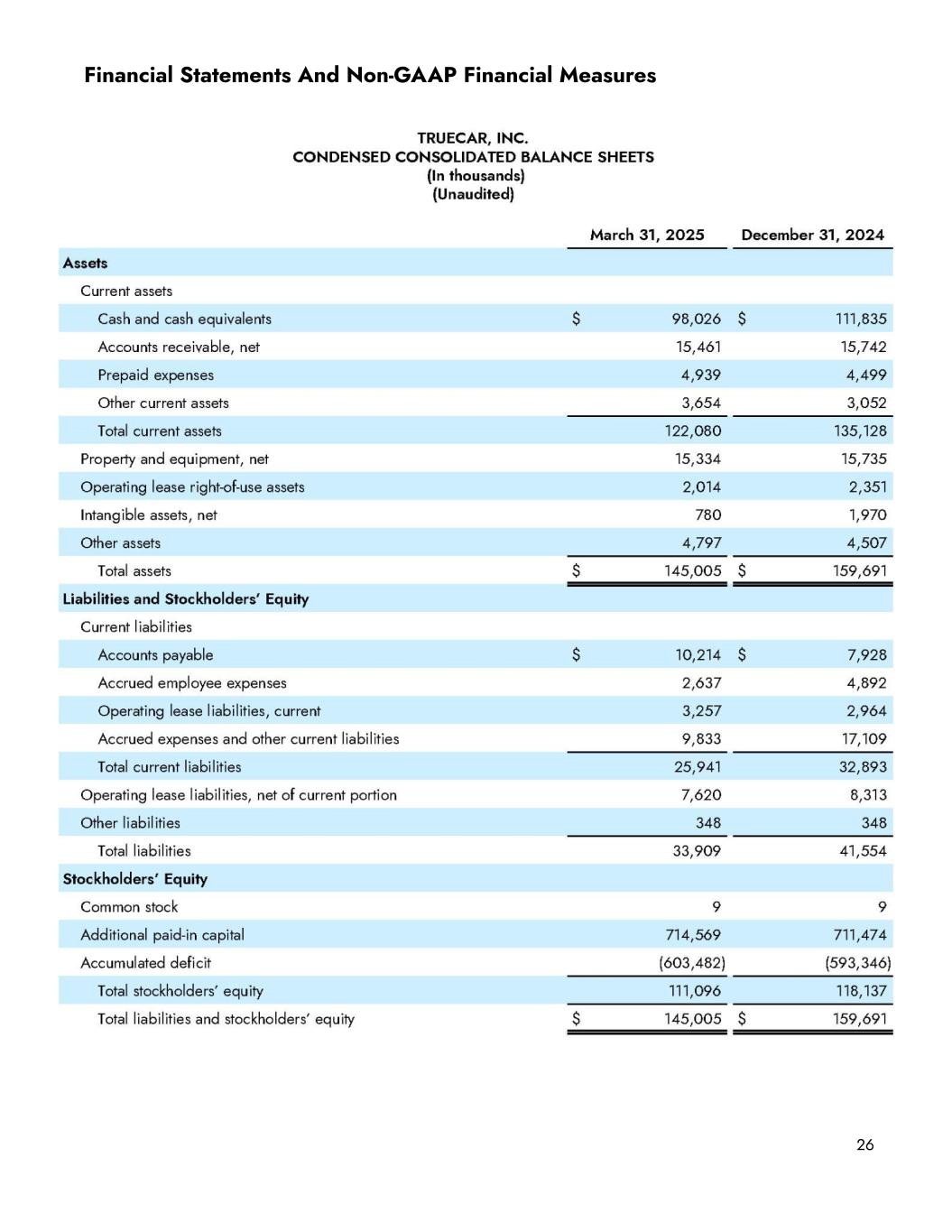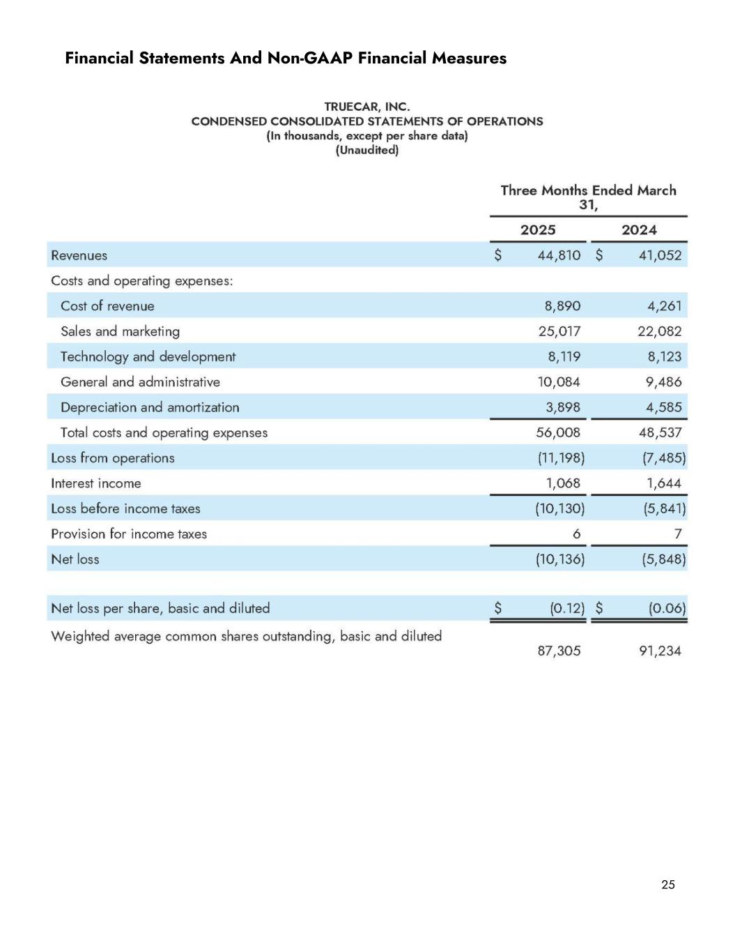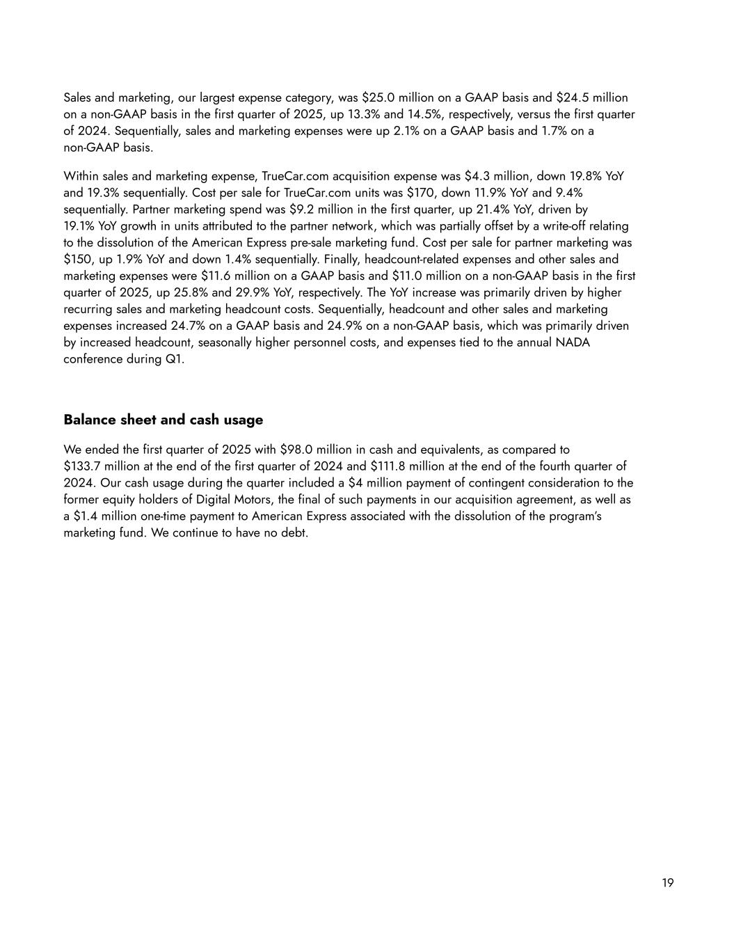 Sales and marketing, our largest expense category, was $25.0 million on a GAAP basis and $24.5 million on a non-GAAP basis in the first quarter of 2025, up 13.3% and 14.5%, respectively, versus the first quarter of 2024. Sequentially, sales and marketing expenses were up 2.1% on a GAAP basis and 1.7% on a non-GAAP basis. Within sales and marketing expense, TrueCar.com acquisition expense was $4.3 million, down 19.8% YoY and 19.3% sequentially. Cost per sale for TrueCar.com units was $170, down 11.9% YoY and 9.4% sequentially. Partner marketing spend was $9.2 million in the first quarter, up 21.4% YoY, driven by 19.1% YoY growth in units attributed to the partner network, which was partially offset by a write-off relating to the dissolution of the American Express pre-sale marketing fund. Cost per sale for partner marketing was $150, up 1.9% YoY and down 1.4% sequentially. Finally, headcount-related expenses and other sales and marketing expenses were $11.6 million on a GAAP basis and $11.0 million on a non-GAAP basis in the first quarter of 2025, up 25.8% and 29.9% YoY, respectively. The YoY increase was primarily driven by higher recurring sales and marketing headcount costs. Sequentially, headcount and other sales and marketing expenses increased 24.7% on a GAAP basis and 24.9% on a non-GAAP basis, which was primarily driven by increased headcount, seasonally higher personnel costs, and expenses tied to the annual NADA conference during Q1. Balance sheet and cash usage We ended the first quarter of 2025 with $98.0 million in cash and equivalents, as compared to $133.7 million at the end of the first quarter of 2024 and $111.8 million at the end of the fourth quarter of 2024. Our cash usage during the quarter included a $4 million payment of contingent consideration to the former equity holders of Digital Motors, the final of such payments in our acquisition agreement, as well as a $1.4 million one-time payment to American Express associated with the dissolution of the program’s marketing fund. We continue to have no debt. 19
