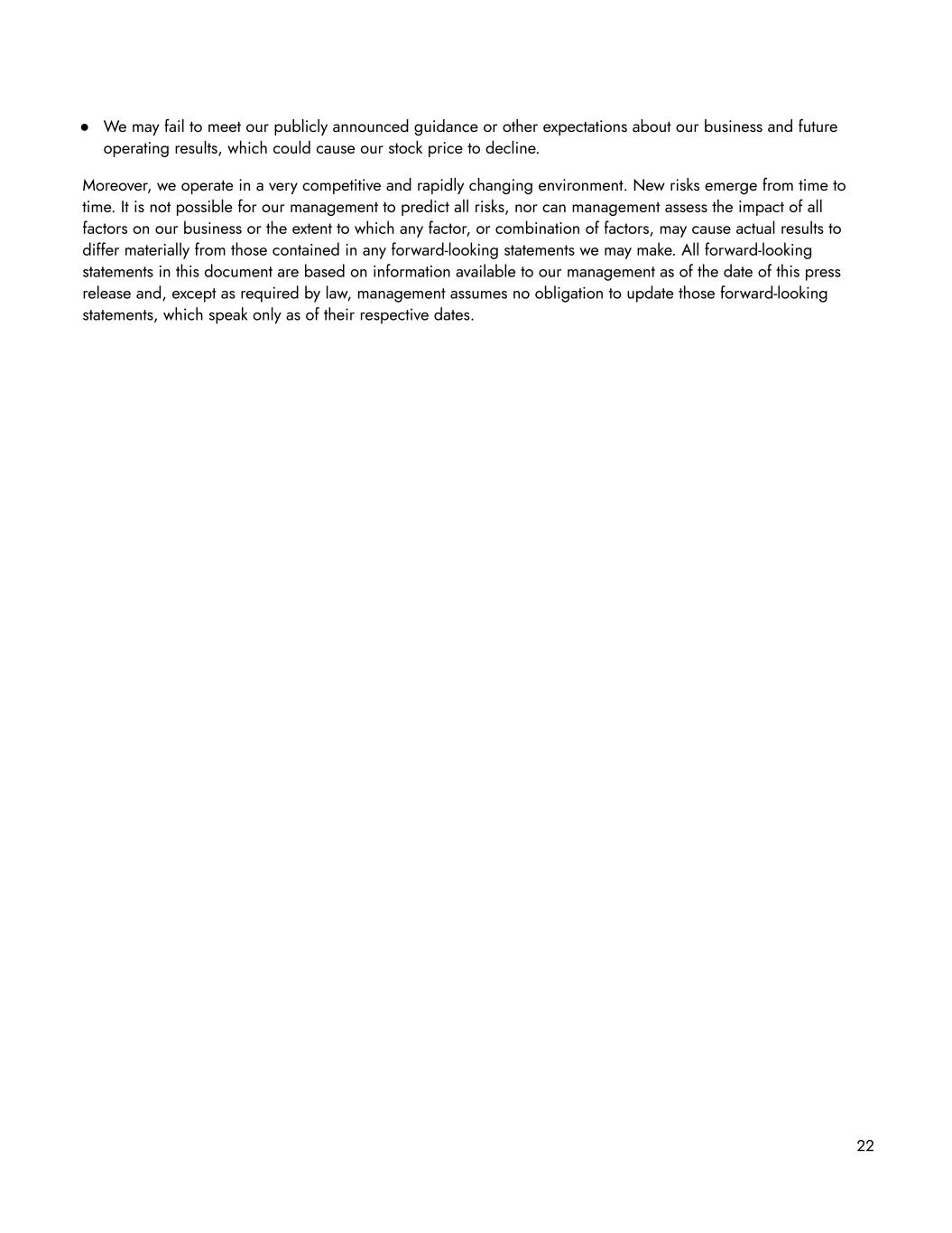 ● We may fail to meet our publicly announced guidance or other expectations about our business and future operating results, which could cause our stock price to decline. Moreover, we operate in a very competitive and rapidly changing environment. New risks emerge from time to time. It is not possible for our management to predict all risks, nor can management assess the impact of all factors on our business or the extent to which any factor, or combination of factors, may cause actual results to differ materially from those contained in any forward-looking statements we may make. All forward-looking statements in this document are based on information available to our management as of the date of this press release and, except as required by law, management assumes no obligation to update those forward-looking statements, which speak only as of their respective dates. 22