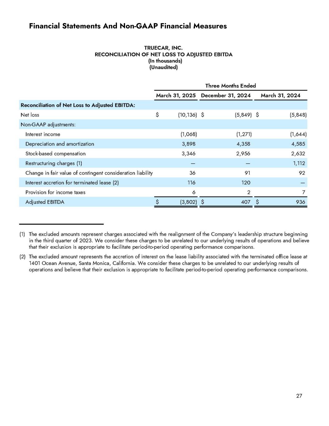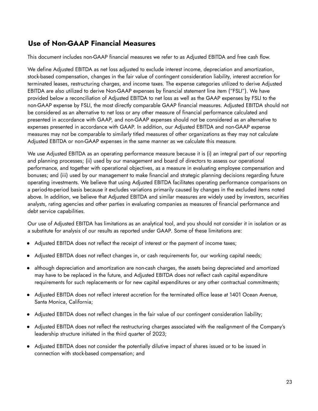 Use of Non-GAAP Financial Measures This document includes non-GAAP financial measures we refer to as Adjusted EBITDA and free cash flow. We define Adjusted EBITDA as net loss adjusted to exclude interest income, depreciation and amortization, stock-based compensation, changes in the fair value of contingent consideration liability, interest accretion for terminated leases, restructuring charges, and income taxes. The expense categories utilized to derive Adjusted EBITDA are also utilized to derive Non-GAAP expenses by financial statement line item (“FSLI”). We have provided below a reconciliation of Adjusted EBITDA to net loss as well as the GAAP expenses by FSLI to the non-GAAP expense by FSLI, the most directly comparable GAAP financial measures. Adjusted EBITDA should not be considered as an alternative to net loss or any other measure of financial performance calculated and presented in accordance with GAAP, and non-GAAP expenses should not be considered as an alternative to expenses presented in accordance with GAAP. In addition, our Adjusted EBITDA and non-GAAP expense measures may not be comparable to similarly titled measures of other organizations as they may not calculate Adjusted EBITDA or non-GAAP expenses in the same manner as we calculate this measure. We use Adjusted EBITDA as an operating performance measure because it is (i) an integral part of our reporting and planning processes; (ii) used by our management and board of directors to assess our operational performance, and together with operational objectives, as a measure in evaluating employee compensation and bonuses; and (iii) used by our management to make financial and strategic planning decisions regarding future operating investments. We believe that using Adjusted EBITDA facilitates operating performance comparisons on a period-to-period basis because it excludes variations primarily caused by changes in the excluded items noted above. In addition, we believe that Adjusted EBITDA and similar measures are widely used by investors, securities analysts, rating agencies and other parties in evaluating companies as measures of financial performance and debt service capabilities. Our use of Adjusted EBITDA has limitations as an analytical tool, and you should not consider it in isolation or as a substitute for analysis of our results as reported under GAAP. Some of these limitations are: ● Adjusted EBITDA does not reflect the receipt of interest or the payment of income taxes; ● Adjusted EBITDA does not reflect changes in, or cash requirements for, our working capital needs; ● although depreciation and amortization are non-cash charges, the assets being depreciated and amortized may have to be replaced in the future, and Adjusted EBITDA does not reflect cash capital expenditure requirements for such replacements or for new capital expenditures or any other contractual commitments; ● Adjusted EBITDA does not reflect interest accretion for the terminated office lease at 1401 Ocean Avenue, Santa Monica, California; ● Adjusted EBITDA does not reflect changes in the fair value of our contingent consideration liability; ● Adjusted EBITDA does not reflect the restructuring charges associated with the realignment of the Company’s leadership structure initiated in the third quarter of 2023; ● Adjusted EBITDA does not consider the potentially dilutive impact of shares issued or to be issued in connection with stock-based compensation; and 23