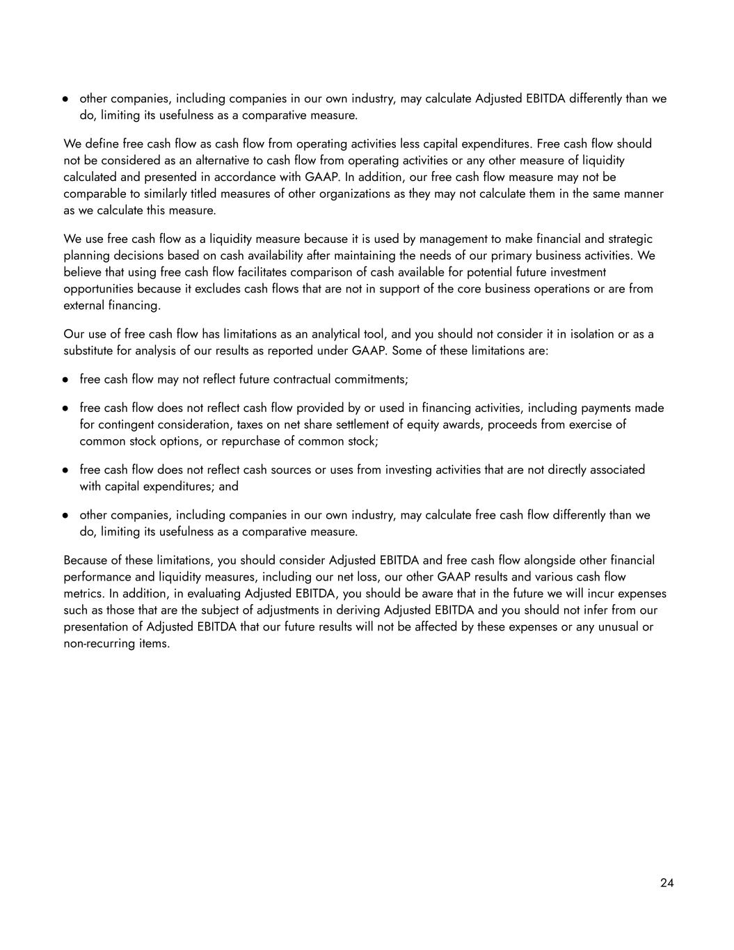 ● other companies, including companies in our own industry, may calculate Adjusted EBITDA differently than we do, limiting its usefulness as a comparative measure. We define free cash flow as cash flow from operating activities less capital expenditures. Free cash flow should not be considered as an alternative to cash flow from operating activities or any other measure of liquidity calculated and presented in accordance with GAAP. In addition, our free cash flow measure may not be comparable to similarly titled measures of other organizations as they may not calculate them in the same manner as we calculate this measure. We use free cash flow as a liquidity measure because it is used by management to make financial and strategic planning decisions based on cash availability after maintaining the needs of our primary business activities. We believe that using free cash flow facilitates comparison of cash available for potential future investment opportunities because it excludes cash flows that are not in support of the core business operations or are from external financing. Our use of free cash flow has limitations as an analytical tool, and you should not consider it in isolation or as a substitute for analysis of our results as reported under GAAP. Some of these limitations are: ● free cash flow may not reflect future contractual commitments; ● free cash flow does not reflect cash flow provided by or used in financing activities, including payments made for contingent consideration, taxes on net share settlement of equity awards, proceeds from exercise of common stock options, or repurchase of common stock; ● free cash flow does not reflect cash sources or uses from investing activities that are not directly associated with capital expenditures; and ● other companies, including companies in our own industry, may calculate free cash flow differently than we do, limiting its usefulness as a comparative measure. Because of these limitations, you should consider Adjusted EBITDA and free cash flow alongside other financial performance and liquidity measures, including our net loss, our other GAAP results and various cash flow metrics. In addition, in evaluating Adjusted EBITDA, you should be aware that in the future we will incur expenses such as those that are the subject of adjustments in deriving Adjusted EBITDA and you should not infer from our presentation of Adjusted EBITDA that our future results will not be affected by these expenses or any unusual or non-recurring items. 24