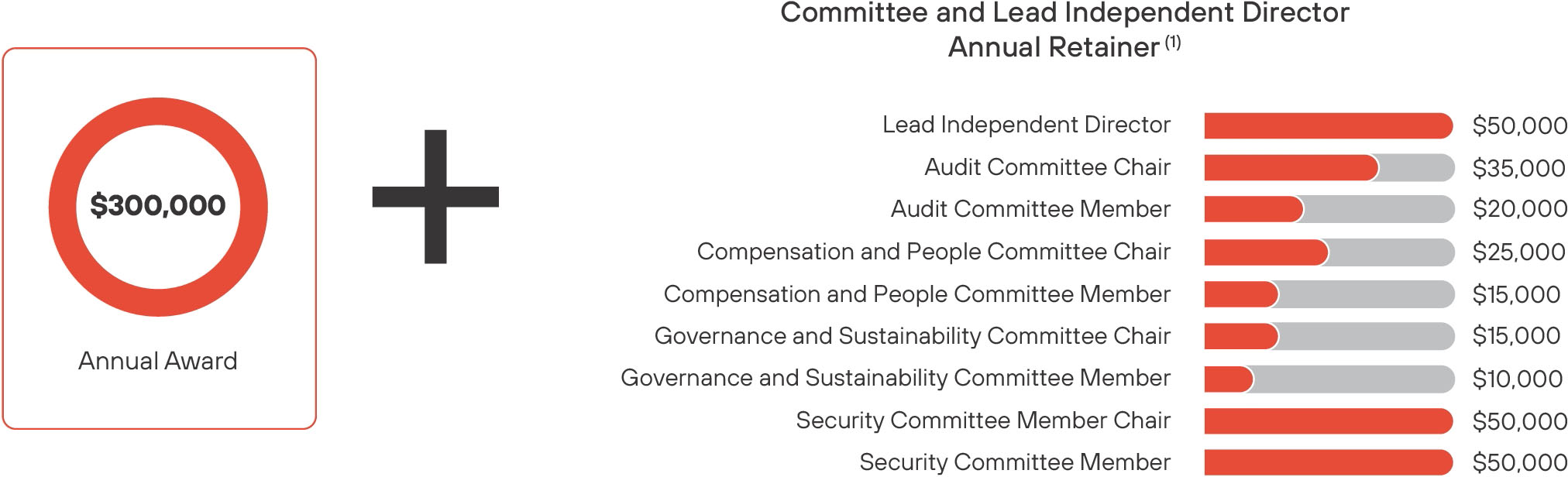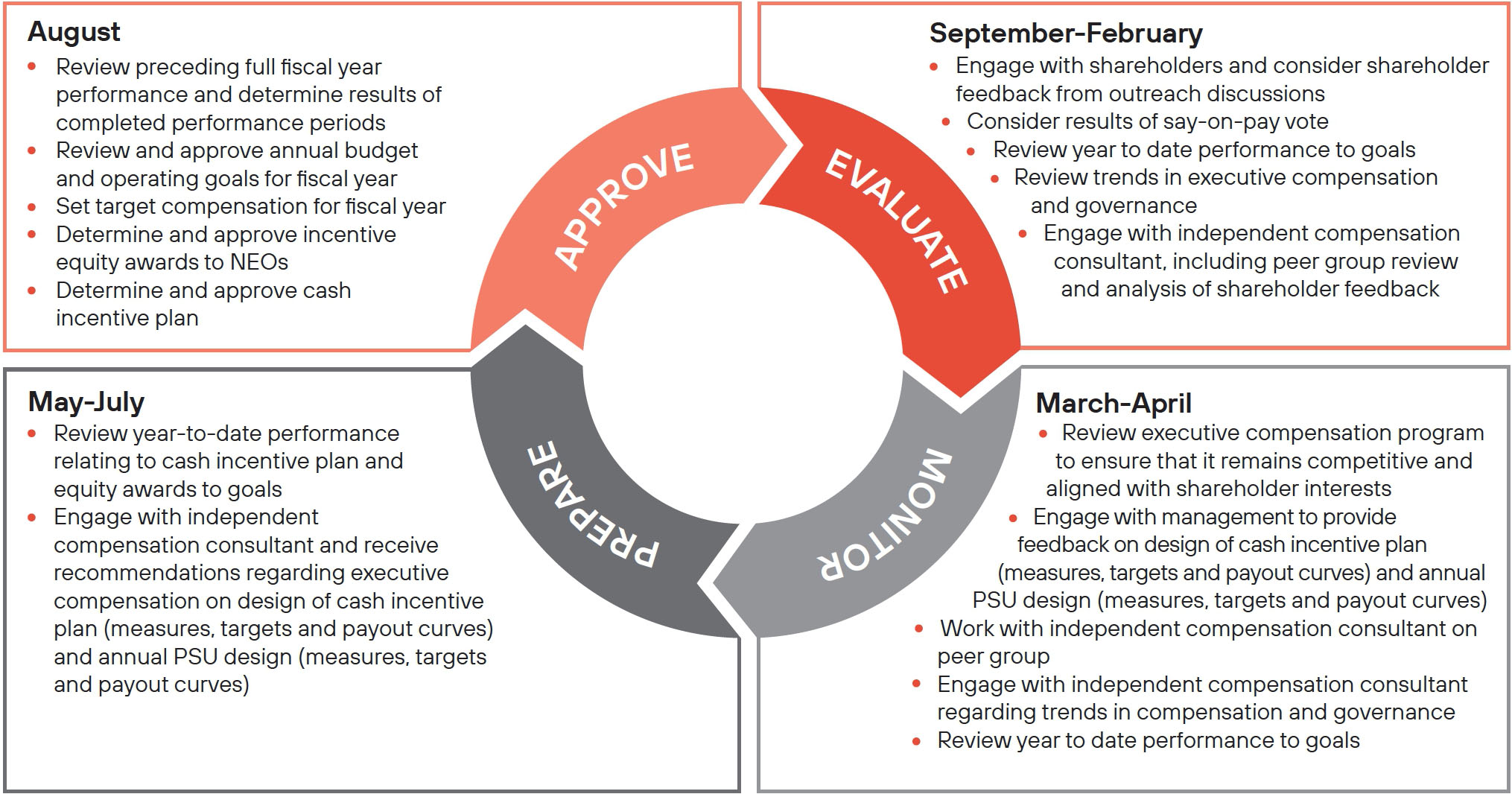 Executive Compensation. We remain committed to an executive compensation program that is truly pay-for-performance. For fiscal 2024, 100% of our named executive officers’ equity compensation awards were performance-based, with different performance targets than the cash incentive plan awards, and over 97% of my compensation and, on average, approximately 94% of our other named executive officers’ compensation was performance-based. Understanding that you were not completely satisfied with our executive compensation program in fiscal 2024, our Compensation and People Committee made a number of important changes to our executive compensation programs for fiscal 2025, particularly to the equity compensation program, which we believe address the core concerns raised by you. In the pages that follow, our Lead Independent Director, John Donovan, and our Compensation and People Committee describe these changes to you in detail.