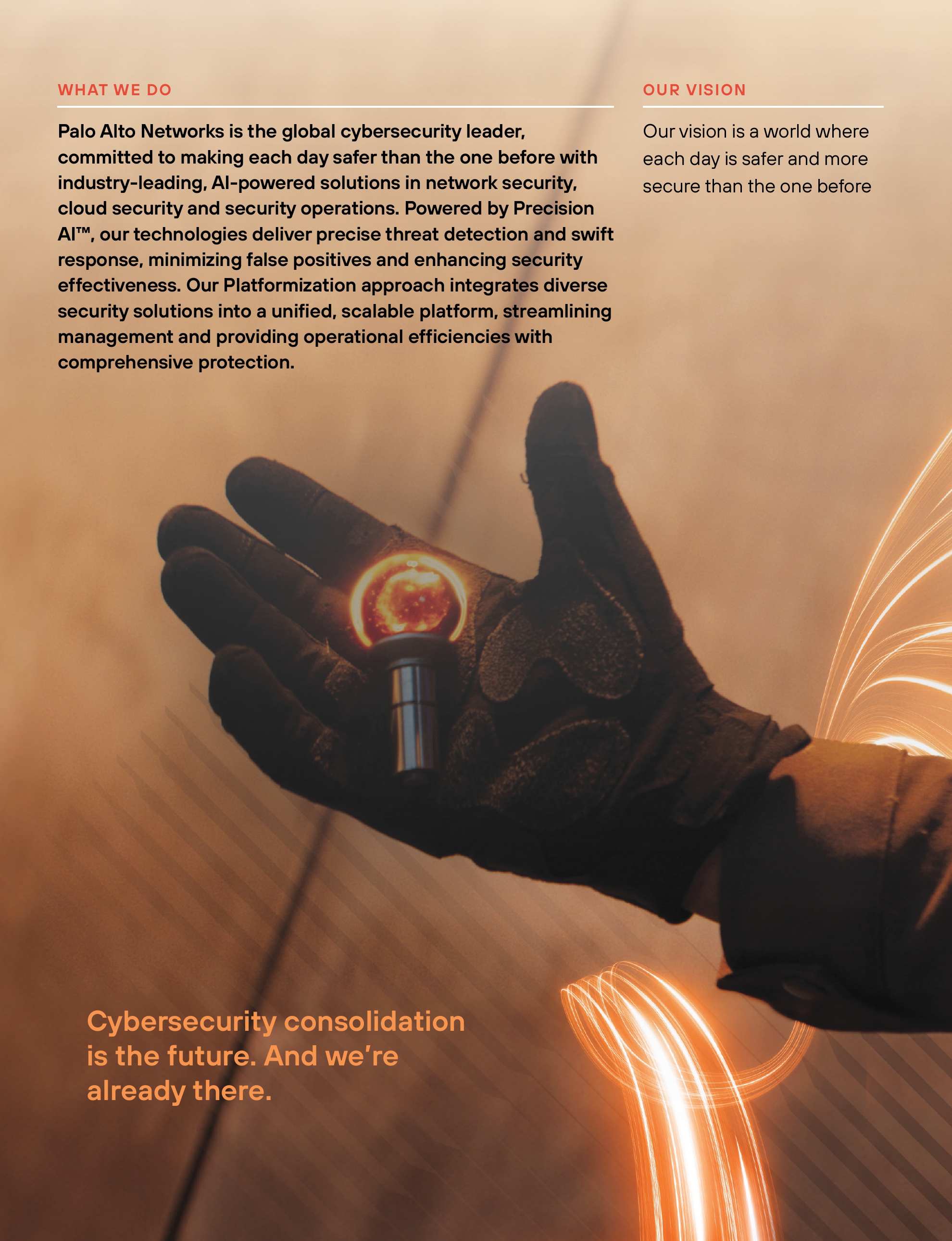 I have never been more excited about the future of our company and our industry. As I have expressed in this letter over the past several years, I am incredibly proud of the work Palo Alto Networks and its employees have done with our customers and partners to achieve our vision - a world where each day is safer and more secure than the one before.