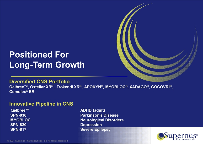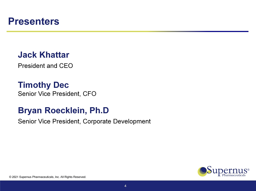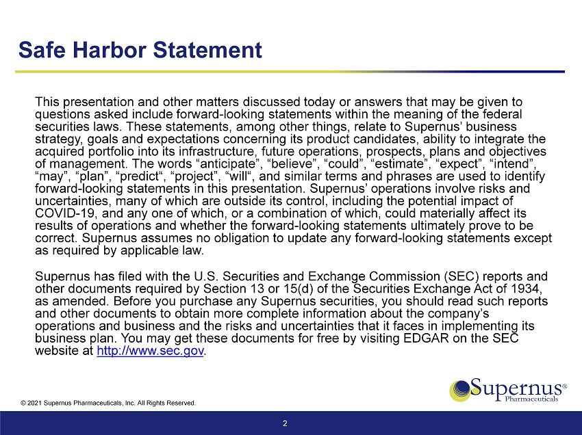 © 2021 Supernus Pharmaceuticals, Inc. All Rights Reserved. Safe Harbor Statement This presentation and other matters discussed today or answers that may be given to questions asked include forward - looking statements within the meaning of the federal securities laws. These statements, among other things, relate to Supernus’ business strategy, goals and expectations concerning its product candidates, ability to integrate the acquired portfolio into its infrastructure, future operations, prospects, plans and objectives of management. The words “anticipate”, “believe”, “could”, “estimate”, “expect”, “intend”, “may”, “plan”, “predict“, “project”, “will“, and similar terms and phrases are used to identify forward - looking statements in this presentation. Supernus’ operations involve risks and uncertainties, many of which are outside its control, including the potential impact of COVID - 19, and any one of which, or a combination of which, could materially affect its results of operations and whether the forward - looking statements ultimately prove to be correct. Supernus assumes no obligation to update any forward - looking statements except as required by applicable law. Supernus has filed with the U.S. Securities and Exchange Commission (SEC) reports and other documents required by Section 13 or 15(d) of the Securities Exchange Act of 1934, as amended. Before you purchase any Supernus securities, you should read such reports and other documents to obtain more complete information about the company’s operations and business and the risks and uncertainties that it faces in implementing its business plan. You may get these documents for free by visiting EDGAR on the SEC website at http://www.sec.gov . 2