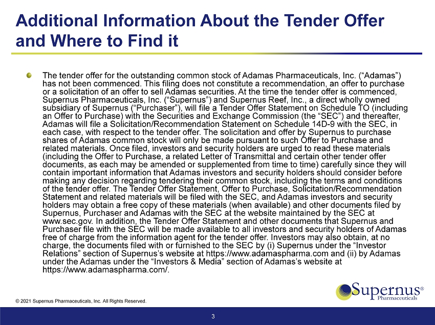 © 2021 Supernus Pharmaceuticals, Inc. All Rights Reserved. Additional Information About the Tender Offer and Where to Find it The tender offer for the outstanding common stock of Adamas Pharmaceuticals, Inc. (“Adamas”) has not been commenced. This filing does not constitute a recommendation, an offer to purchase or a solicitation of an offer to sell Adamas securities. At the time the tender offer is commenced, Supernus Pharmaceuticals, Inc. (“Supernus”) and Supernus Reef, Inc., a direct wholly owned subsidiary of Supernus (“Purchaser”), will file a Tender Offer Statement on Schedule TO (including an Offer to Purchase) with the Securities and Exchange Commission (the “SEC”) and thereafter, Adamas will file a Solicitation/Recommendation Statement on Schedule 14D - 9 with the SEC, in each case, with respect to the tender offer. The solicitation and offer by Supernus to purchase shares of Adamas common stock will only be made pursuant to such Offer to Purchase and related materials. Once filed, investors and security holders are urged to read these materials (including the Offer to Purchase, a related Letter of Transmittal and certain other tender offer documents, as each may be amended or supplemented from time to time) carefully since they will contain important information that Adamas investors and security holders should consider before making any decision regarding tendering their common stock, including the terms and conditions of the tender offer. The Tender Offer Statement, Offer to Purchase, Solicitation/Recommendation Statement and related materials will be filed with the SEC, and Adamas investors and security holders may obtain a free copy of these materials (when available) and other documents filed by Supernus, Purchaser and Adamas with the SEC at the website maintained by the SEC at www.sec.gov. In addition, the Tender Offer Statement and other documents that Supernus and Purchaser file with the SEC will be made available to all investors and security holders of Adamas free of charge from the information agent for the tender offer. Investors may also obtain, at no charge, the documents filed with or furnished to the SEC by (i) Supernus under the “Investor Relations” section of Supernus’s website at https://www.adamaspharma.com and (ii) by Adamas under the Adamas under the “Investors & Media” section of Adamas’s website at https://www.adamaspharma.com/. 3