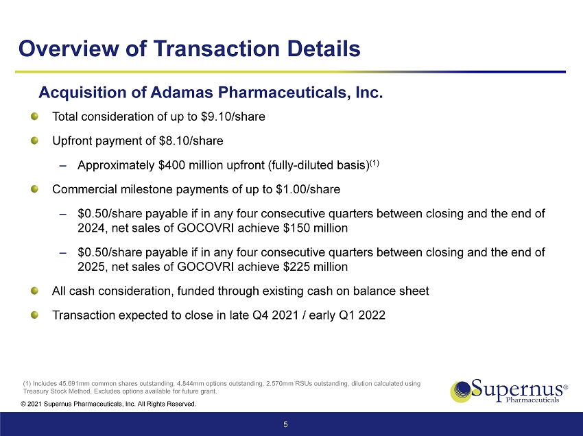 © 2021 Supernus Pharmaceuticals, Inc. All Rights Reserved. Jack Khattar President and CEO Timothy Dec Senior Vice President, CFO Bryan Roecklein, Ph.D Senior Vice President, Corporate Development Presenters 4