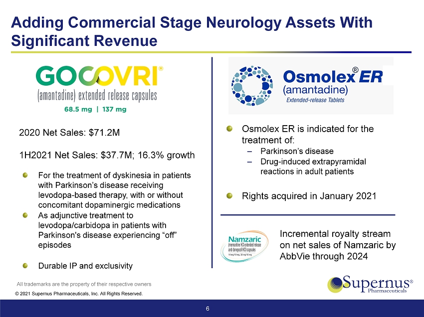 © 2021 Supernus Pharmaceuticals, Inc. All Rights Reserved. 5 Overview of Transaction Details Total consideration of up to $9.10/share Upfront payment of $8.10/share ‒ Approximately $400 million upfront (fully - diluted basis) (1) Commercial milestone payments of up to $1.00/share ‒ $0.50/share payable if in any four consecutive quarters between closing and the end of 2024, net sales of GOCOVRI achieve $150 million ‒ $0.50/share payable if in any four consecutive quarters between closing and the end of 2025, net sales of GOCOVRI achieve $225 million All cash consideration, funded through existing cash on balance sheet Transaction expected to close in late Q4 2021 / early Q1 2022 Acquisition of Adamas Pharmaceuticals, Inc. (1) Includes 45.691mm common shares outstanding, 4.844mm options outstanding, 2.570mm RSUs outstanding, dilution calculated u sin g Treasury Stock Method. Excludes options available for future grant.