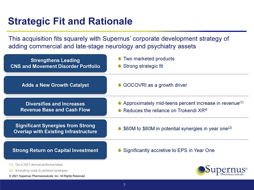 © 2021 Supernus Pharmaceuticals, Inc. All Rights Reserved. 6 Adding Commercial Stage Neurology Assets With Significant Revenue 2020 Net Sales: $71.2M 1H2021 Net Sales: $37.7M; 16.3% growth All trademarks are the property of their respective owners For the treatment of dyskinesia in patients with Parkinson’s disease receiving levodopa - based therapy, with or without concomitant dopaminergic medications As adjunctive treatment to levodopa/carbidopa in patients with Parkinson's disease experiencing “off” episodes Durable IP and exclusivity Incremental royalty stream on net sales of Namzaric by AbbVie through 2024 Osmolex ER is indicated for the treatment of: ‒ Parkinson’s disease ‒ Drug - induced extrapyramidal reactions in adult patients Rights acquired in January 2021 ®
