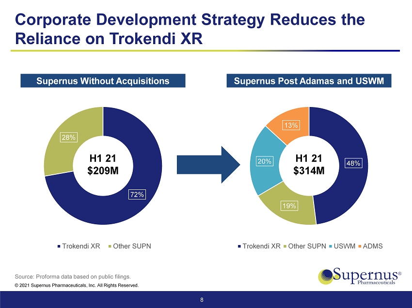 | ● | Combined with the acquisition of US WorldMeds CNS products in 2020, this transaction significantly reduces the reliance on net sales of Trokendi XR®. In the first half of 2021 and on a combined proforma basis (including revenue from US WorldMeds and Adamas transactions), net sales of Trokendi XR® represent 48% of Supernus revenues down from 72% (excluding revenue from these transactions). |