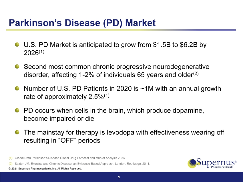 © 2021 Supernus Pharmaceuticals, Inc. All Rights Reserved. 72% 28% Trokendi XR Other SUPN 48% 19% 20% 13% Trokendi XR Other SUPN USWM ADMS Corporate Development Strategy Reduces the Reliance on Trokendi XR 8 Source: Proforma data based on public filings. H1 21 $209M H1 21 $314M Supernus Without Acquisitions Supernus Post Adamas and USWM