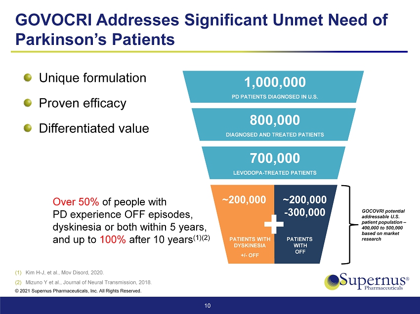 © 2021 Supernus Pharmaceuticals, Inc. All Rights Reserved. Parkinson’s Disease (PD) Market U.S. PD Market is anticipated to grow from $1.5B to $6.2B by 2026 (1) Second most common chronic progressive neurodegenerative disorder, affecting 1 - 2% of individuals 65 years and older (2) Number of U.S. PD Patients in 2020 is ~1M with an annual growth rate of approximately 2.5% (1) PD occurs when cells in the brain, which produce dopamine, become impaired or die The mainstay for therapy is levodopa with effectiveness wearing off resulting in “OFF” periods 9 (1) Global Data Parkinson’s Disease Global Drug Forecast and Market Analysis 2026. (2) Saxton JM. Exercise and Chronic Disease: an Evidence - Based Approach. London, Routledge, 2011.