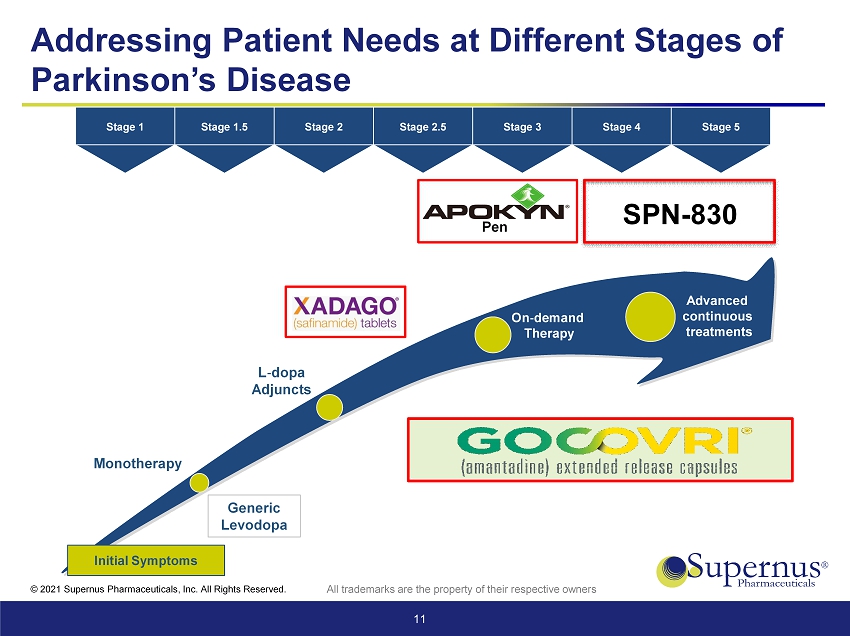 © 2021 Supernus Pharmaceuticals, Inc. All Rights Reserved. GOVOCRI Addresses Significant Unmet Need of Parkinson’s Patients Unique formulation Proven efficacy Differentiated value 10 (1) Kim H - J, et al., Mov Disord , 2020. (2) Mizuno Y et al., Journal of Neural Transmission, 2018. GOCOVRI potential addressable U.S. patient population – 400,000 to 500,000 based on market research 1,000,000 PD PATIENTS DIAGNOSED IN U.S. 800,000 DIAGNOSED AND TREATED PATIENTS 700,000 LEVODOPA - TREATED PATIENTS PATIENTS WITH DYSKINESIA +/ - OFF ~200,000 ~200,000 - 300,000 + PATIENTS WITH OFF Over 50% of people with PD experience OFF episodes, dyskinesia or both within 5 years, and up to 100% after 10 years (1)(2)