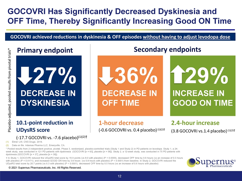 © 2021 Supernus Pharmaceuticals, Inc. All Rights Reserved. Addressing Patient Needs at Different Stages of Parkinson’s Disease 11 Stage 1 Stage 1.5 Stage 2 Stage 2.5 Stage 3 Stage 4 Stage 5 Generic Levodopa Initial Symptoms Monotherapy L - dopa Adjuncts On - demand Therapy Advanced continuous treatments Pen SPN - 830 All trademarks are the property of their respective owners