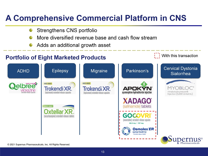 © 2021 Supernus Pharmaceuticals, Inc. All Rights Reserved. A Comprehensive Commercial Platform in CNS 13 Strengthens CNS portfolio More diversified revenue base and cash flow stream Adds an additional growth asset Epilepsy Migraine Cervical Dystonia Sialorrhea Parkinson’s ADHD Portfolio of Eight Marketed Products With this transaction