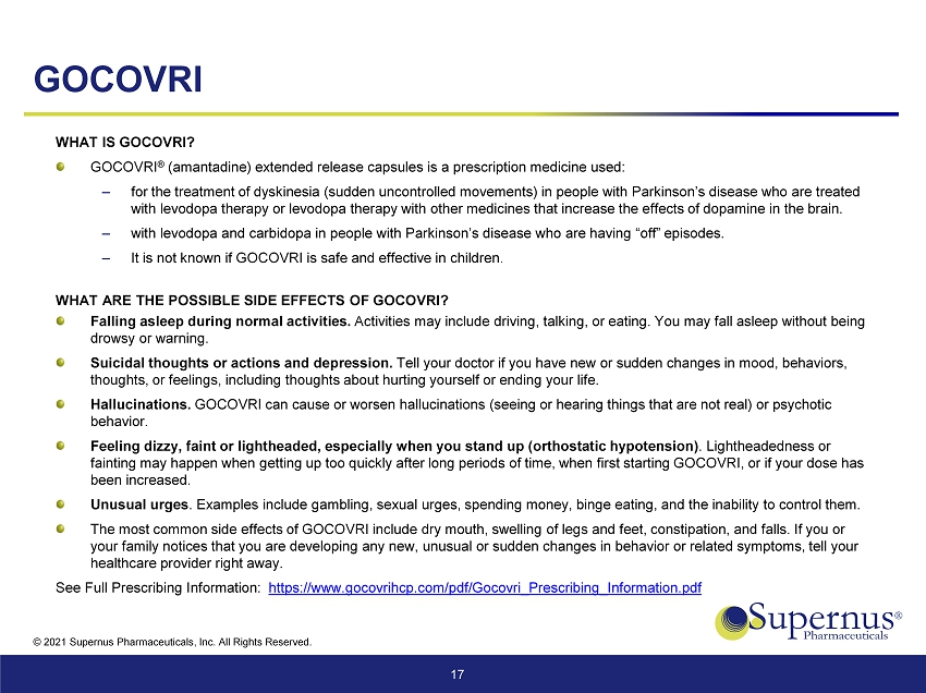 © 2021 Supernus Pharmaceuticals, Inc. All Rights Reserved. 17 GOCOVRI WHAT IS GOCOVRI? GOCOVRI ® (amantadine) extended release capsules is a prescription medicine used: ‒ for the treatment of dyskinesia (sudden uncontrolled movements) in people with Parkinson’s disease who are treated with levodopa therapy or levodopa therapy with other medicines that increase the effects of dopamine in the brain. ‒ with levodopa and carbidopa in people with Parkinson’s disease who are having “off” episodes. ‒ It is not known if GOCOVRI is safe and effective in children. WHAT ARE THE POSSIBLE SIDE EFFECTS OF GOCOVRI? Falling asleep during normal activities. Activities may include driving, talking, or eating. You may fall asleep without being drowsy or warning. Suicidal thoughts or actions and depression. Tell your doctor if you have new or sudden changes in mood, behaviors, thoughts, or feelings, including thoughts about hurting yourself or ending your life. Hallucinations. GOCOVRI can cause or worsen hallucinations (seeing or hearing things that are not real) or psychotic behavior. Feeling dizzy, faint or lightheaded, especially when you stand up (orthostatic hypotension) . Lightheadedness or fainting may happen when getting up too quickly after long periods of time, when first starting GOCOVRI, or if your dose has been increased. Unusual urges . Examples include gambling, sexual urges, spending money, binge eating, and the inability to control them. The most common side effects of GOCOVRI include dry mouth, swelling of legs and feet, constipation, and falls. If you or your family notices that you are developing any new, unusual or sudden changes in behavior or related symptoms, tell your healthcare provider right away. See Full Prescribing Information: https://www.gocovrihcp.com/pdf/Gocovri_Prescribing_Information.pdf