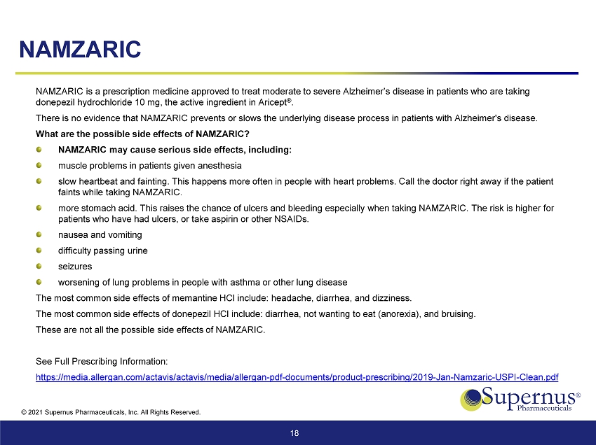 © 2021 Supernus Pharmaceuticals, Inc. All Rights Reserved. NAMZARIC 18 NAMZARIC is a prescription medicine approved to treat moderate to severe Alzheimer’s disease in patients who are taking donepezil hydrochloride 10 mg, the active ingredient in Aricept ® . There is no evidence that NAMZARIC prevents or slows the underlying disease process in patients with Alzheimer's disease. What are the possible side effects of NAMZARIC? NAMZARIC may cause serious side effects, including: muscle problems in patients given anesthesia slow heartbeat and fainting. This happens more often in people with heart problems. Call the doctor right away if the patient faints while taking NAMZARIC. more stomach acid. This raises the chance of ulcers and bleeding especially when taking NAMZARIC. The risk is higher for patients who have had ulcers, or take aspirin or other NSAIDs. nausea and vomiting difficulty passing urine seizures worsening of lung problems in people with asthma or other lung disease The most common side effects of memantine HCl include: headache, diarrhea, and dizziness. The most common side effects of donepezil HCl include: diarrhea, not wanting to eat (anorexia), and bruising. These are not all the possible side effects of NAMZARIC. See Full Prescribing Information: https://media.allergan.com/actavis/actavis/media/allergan - pdf - documents/product - prescribing/2019 - Jan - Namzaric - USPI - Clean.pdf