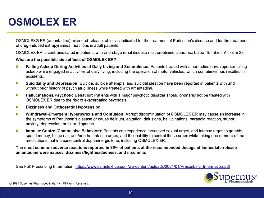 © 2021 Supernus Pharmaceuticals, Inc. All Rights Reserved. OSMOLEX ER 19 OSMOLEX® ER (amantadine) extended - release tablets is indicated for the treatment of Parkinson’s disease and for the treatment of drug - induced extrapyramidal reactions in adult patients. OSMOLEX ER is contraindicated in patients with end - stage renal disease (i.e., creatinine clearance below 15 mL/min/1.73 m 2). What are the possible side effects of OSMOLEX ER? Falling Asleep During Activities of Daily Living and Somnolence: Patients treated with amantadine have reported falling asleep while engaged in activities of daily living, including the operation of motor vehicles, which sometimes has resulted i n accidents. Suicidality and Depression: Suicide, suicide attempts, and suicidal ideation have been reported in patients with and without prior history of psychiatric illness while treated with amantadine. Hallucinations/Psychotic Behavior: Patients with a major psychotic disorder should ordinarily not be treated with OSMOLEX ER due to the risk of exacerbating psychosis. Dizziness and Orthostatic Hypotension Withdrawal - Emergent Hyperpyrexia and Confusion: Abrupt discontinuation of OSMOLEX ER may cause an increase in the symptoms of Parkinson’s disease or cause delirium, agitation, delusions, hallucinations, paranoid reaction, stupor, anxiety, depression, or slurred speech. Impulse Control/Compulsive Behaviors: Patients can experience increased sexual urges, and intense urges to gamble, spend money, binge eat, and/or other intense urges, and the inability to control these urges while taking one or more of the medications that increase central dopaminergic tone, including OSMOLEX ER. The most common adverse reactions reported in ≥5% of patients at the recommended dosage of immediate - release amantadine were nausea, dizziness/lightheadedness, and insomnia. See Full Prescribing Information: https://www.osmolexhcp.com/wp - content/uploads/2021/01/Prescribing_Information.pdf