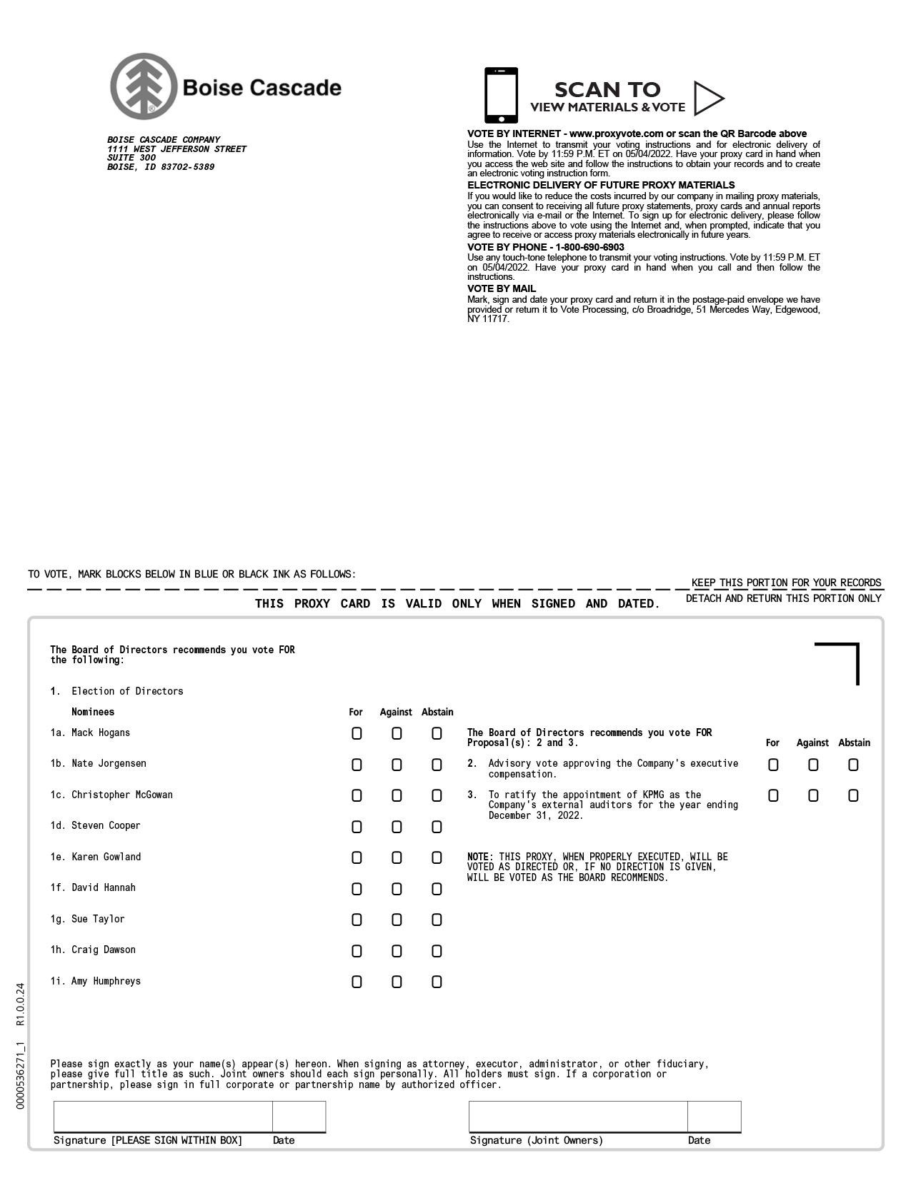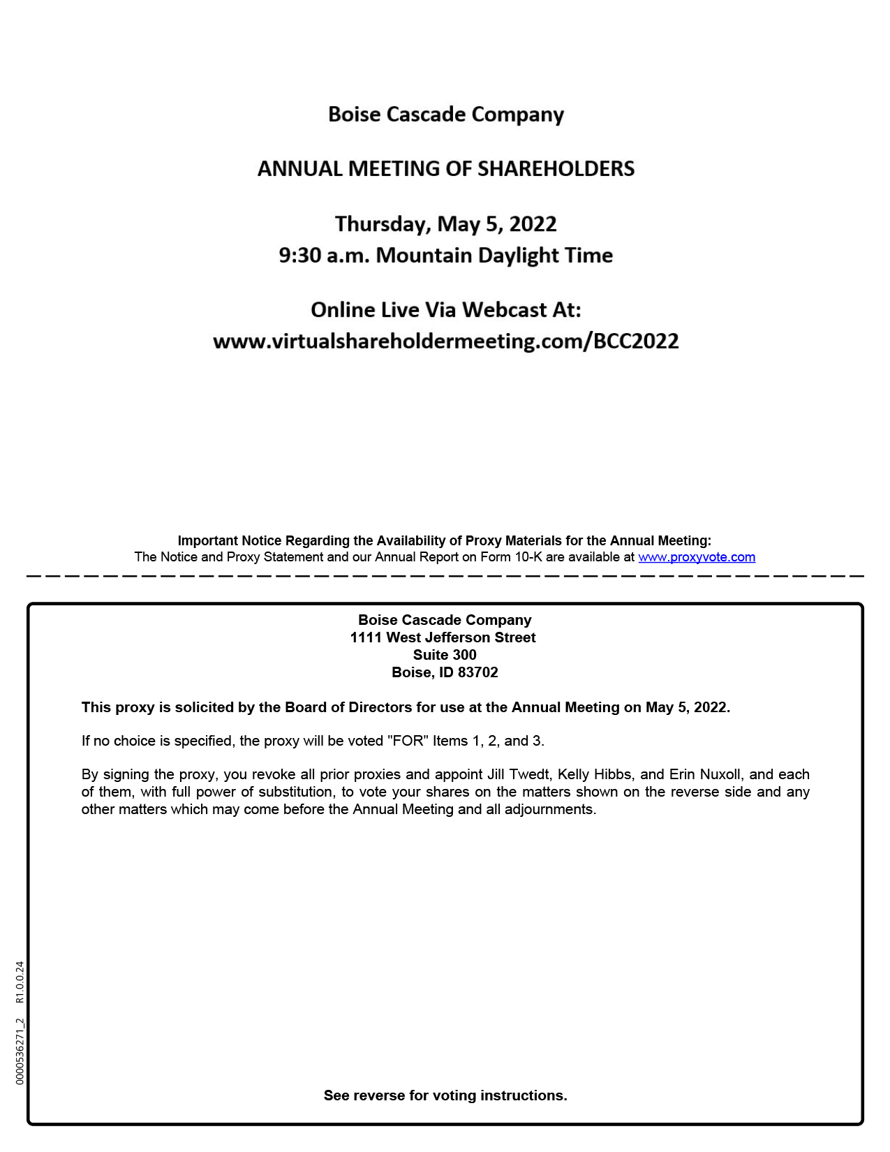 You are cordially invited to join us for our 2022 virtual annual meeting of shareholders, which will be held on Thursday, May 5, 2022, at 9:30 a.m. Mountain Time. As part of our continued precautions regarding COVID-19, the 2022 Annual Meeting of Shareholders of Boise Cascade Company will be held exclusively online via webcast. You will be able to attend the 2022 Annual Meeting, vote your shares electronically, and submit questions during the meeting by visiting www.virtualshareholdermeeting.com/BCC2022. The Notice of Annual Meeting of Shareholders and the Proxy Statement that follow describe the business to be conducted at the meeting.
