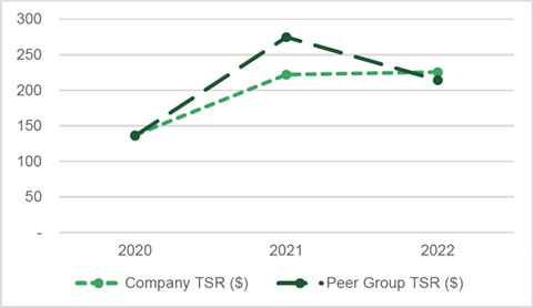 The peer group used for the TSR calculation is comprised of the four companies listed in the table to the right. This is the same peer group reported in the Company's 10K filing. During 2021, Norbord Inc. was removed from the peer group upon being acquired by West Fraser Timber Co. Ltd. The peer group companies has remained otherwise unchanged during the three fiscal years reported.