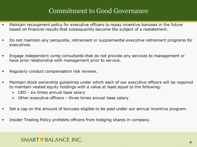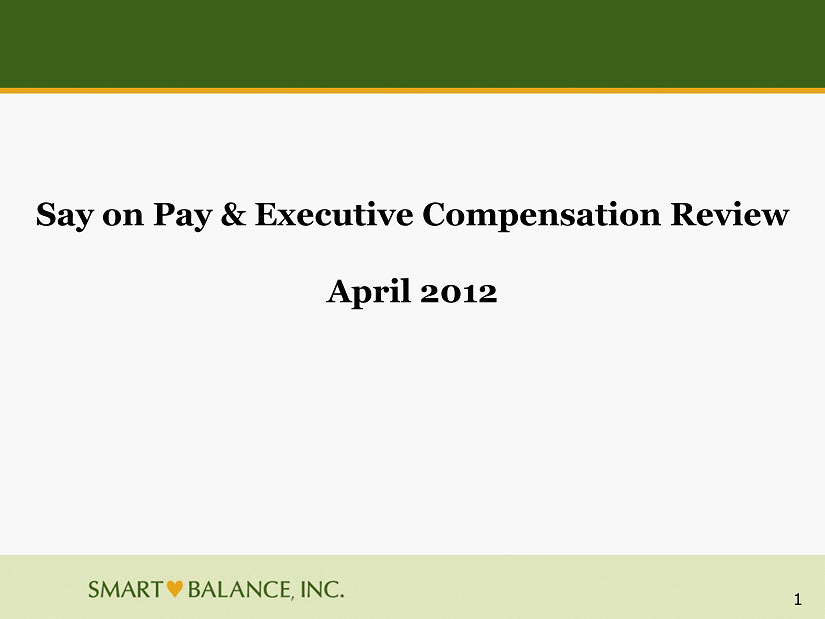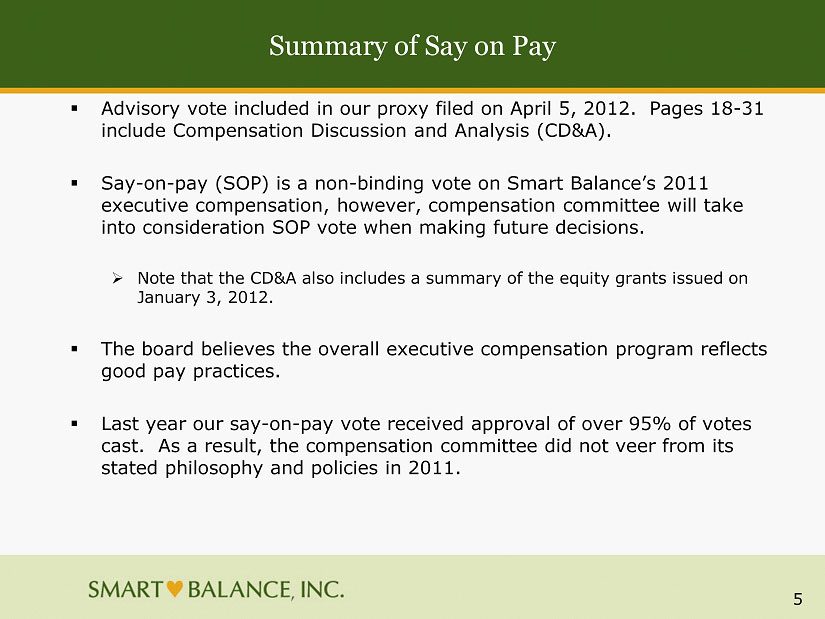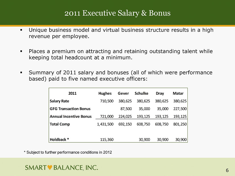 Summary of Say on Pay ▪ Advisory vote included in our proxy filed on April 5, 2012. Pages 18 - 31 include Compensation Discussion and Analysis (CD&A). ▪ Say - on - pay (SOP) is a non - binding vote on Smart Balance’s 2011 executive compensation, however, compensation committee will take into consideration SOP vote when making future decisions. » Note that the CD&A also includes a summary of the equity grants issued on January 3, 2012. ▪ The board believes the overall executive compensation program reflects good pay practices. ▪ Last year our say - on - pay vote received approval of over 95% of votes cast. As a result, the compensation committee did not veer from its stated philosophy and policies in 2011. 5