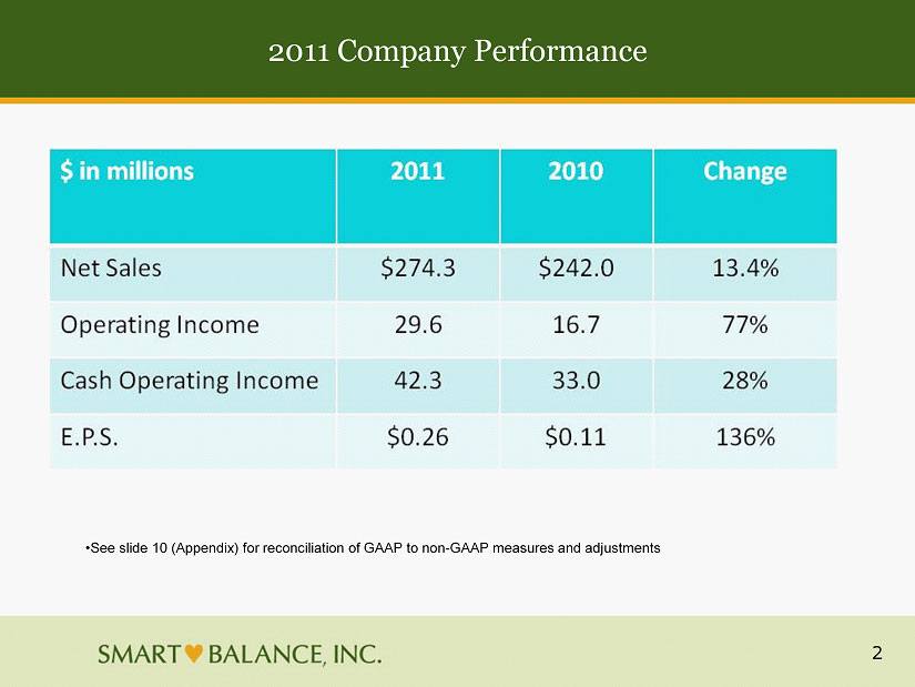 2011 Company Performance 2 • See slide 10 (Appendix) for reconciliation of GAAP to non - GAAP measures and adjustments