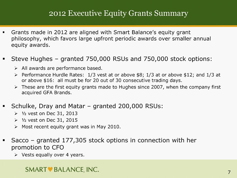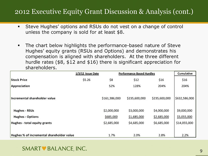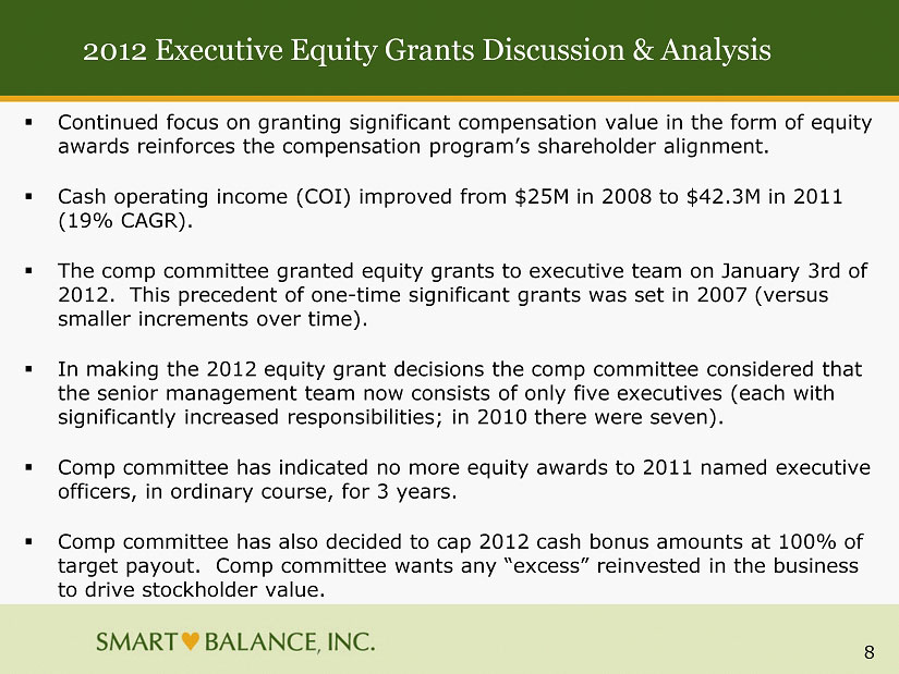 2012 Executive Equity Grants Summary ▪ Grants made in 2012 are aligned with Smart Balance’s equity grant philosophy, which favors large upfront periodic awards over smaller annual equity awards. ▪ Steve Hughes – granted 750,000 RSUs and 750,000 stock options: » All awards are performance based. » Performance Hurdle Rates: 1/3 vest at or above $8; 1/3 at or above $12; and 1/3 at or above $16: all must be for 20 out of 30 consecutive trading days. » These are the first equity grants made to Hughes since 2007, when the company first acquired GFA Brands. ▪ Schulke, Dray and Matar – granted 200,000 RSUs: » ½ vest on Dec 31, 2013 » ½ vest on Dec 31, 2015 » Most recent equity grant was in May 2010. ▪ Sacco – granted 177,305 stock options in connection with her promotion to CFO » Vests equally over 4 years. 7