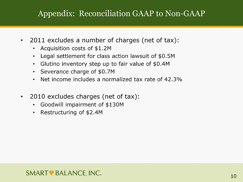 Appendix: Reconciliation GAAP to Non - GAAP • 2011 excludes a number of charges (net of tax): • Acquisition costs of $1.2M • Legal settlement for class action lawsuit of $0.5M • Glutino inventory step up to fair value of $0.4M • Severance charge of $0.7M • Net income includes a normalized tax rate of 42.3% • 2010 excludes charges (net of tax): • Goodwill impairment of $130M • Restructuring of $2.4M 10