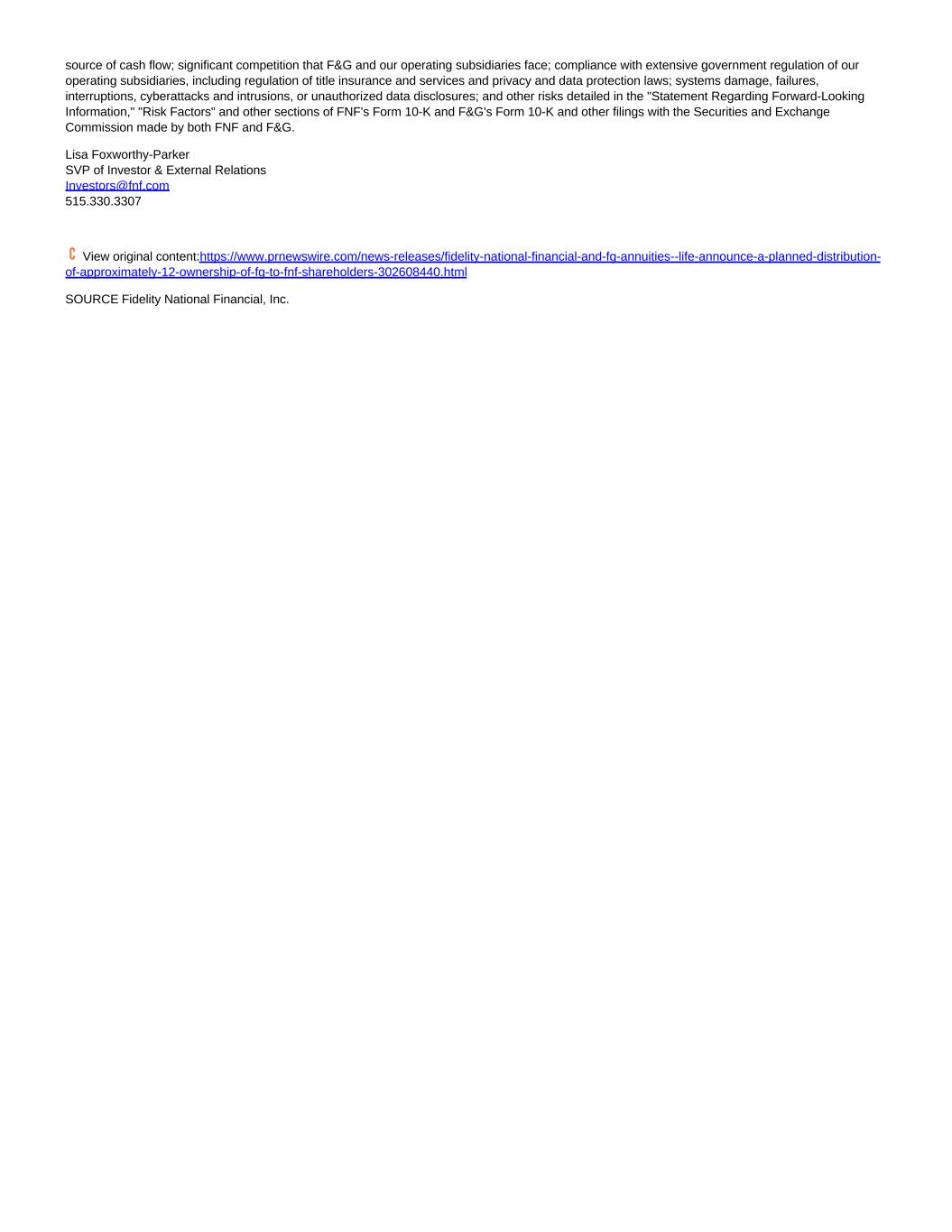 source of cash flow; significant competition that F&G and our operating subsidiaries face; compliance with extensive government regulation of our operating subsidiaries, including regulation of title insurance and services and privacy and data protection laws; systems damage, failures, interruptions, cyberattacks and intrusions, or unauthorized data disclosures; and other risks detailed in the "Statement Regarding Forward-Looking Information," "Risk Factors" and other sections of FNF's Form 10-K and F&G's Form 10-K and other filings with the Securities and Exchange Commission made by both FNF and F&G. Lisa Foxworthy-Parker SVP of Investor & External Relations Investors@fnf.com 515.330.3307 View original content:https://www.prnewswire.com/news-releases/fidelity-national-financial-and-fg-annuities--life-announce-a-planned-distribution- of-approximately-12-ownership-of-fg-to-fnf-shareholders-302608440.html SOURCE Fidelity National Financial, Inc.