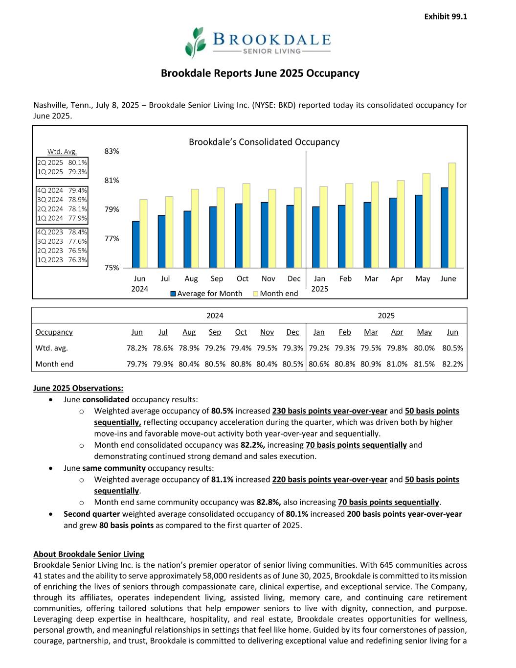 Brookdale Reports June 2025 Occupancy Nashville, Tenn., July 8, 2025 – Brookdale Senior Living Inc. (NYSE: BKD) reported today its consolidated occupancy for June 2025. 2024 2025 Occupancy Jun Jul Aug Sep Oct Nov Dec Jan Feb Mar Apr May Jun Wtd. avg. 78.2% 78.6% 78.9% 79.2% 79.4% 79.5% 79.3% 79.2% 79.3% 79.5% 79.8% 80.0% 80.5% Month end 79.7% 79.9% 80.4% 80.5% 80.8% 80.4% 80.5% 80.6% 80.8% 80.9% 81.0% 81.5% 82.2% June 2025 Observations: June consolidated occupancy results: o Weighted average occupancy of 80.5% increased 230 basis points year-over-year and 50 basis points sequentially, reflecting occupancy acceleration during the quarter, which was driven both by higher move-ins and favorable move-out activity both year-over-year and sequentially. o Month end consolidated occupancy was 82.2%, increasing 70 basis points sequentially and demonstrating continued strong demand and sales execution. June same community occupancy results: o Weighted average occupancy of 81.1% increased 220 basis points year-over-year and 50 basis points sequentially. o Month end same community occupancy was 82.8%, also increasing 70 basis points sequentially. Second quarter weighted average consolidated occupancy of 80.1% increased 200 basis points year-over-year and grew 80 basis points as compared to the first quarter of 2025. About Brookdale Senior Living Brookdale Senior Living Inc. is the nation’s premier operator of senior living communities. With 645 communities across 41 states and the ability to serve approximately 58,000 residents as of June 30, 2025, Brookdale is committed to its mission of enriching the lives of seniors through compassionate care, clinical expertise, and exceptional service. The Company, through its affiliates, operates independent living, assisted living, memory care, and continuing care retirement communities, offering tailored solutions that help empower seniors to live with dignity, connection, and purpose. Leveraging deep expertise in healthcare, hospitality, and real estate, Brookdale creates opportunities for wellness, personal growth, and meaningful relationships in settings that feel like home. Guided by its four cornerstones of passion, courage, partnership, and trust, Brookdale is committed to delivering exceptional value and redefining senior living for a 75% 77% 79% 81% 83% Jun 2024 Jul Aug Sep Oct Nov Dec Jan 2025 Feb Mar Apr May June Average for Month Month end Wtd. Avg. 2Q 2025 80.1% 1Q 2025 79.3% 4Q 2024 79.4% 3Q 2024 78.9% 2Q 2024 78.1% 1Q 2024 77.9% 4Q 2023 78.4% 3Q 2023 77.6% 2Q 2023 76.5% 1Q 2023 76.3% Brookdale’s Consolidated Occupancy