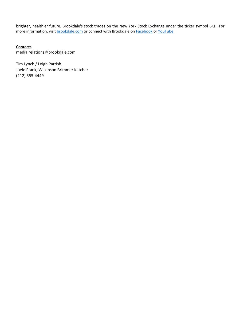 brighter, healthier future. Brookdale's stock trades on the New York Stock Exchange under the ticker symbol BKD. For more information, visit brookdale.com or connect with Brookdale on Facebook or YouTube. Contacts media.relations@brookdale.com Tim Lynch / Leigh Parrish Joele Frank, Wilkinson Brimmer Katcher (212) 355-4449