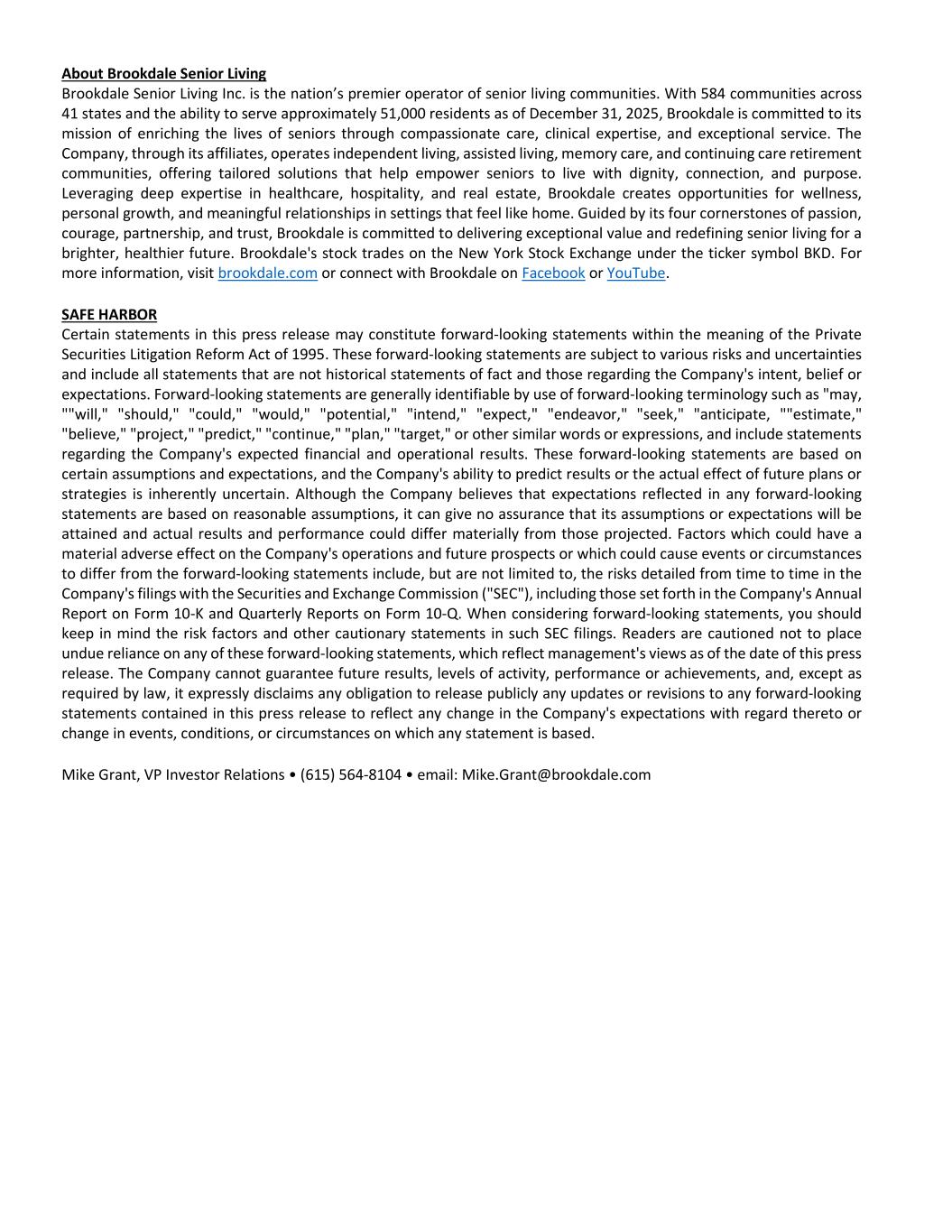 About Brookdale Senior Living Brookdale Senior Living Inc. is the nation’s premier operator of senior living communities. With 584 communities across 41 states and the ability to serve approximately 51,000 residents as of December 31, 2025, Brookdale is committed to its mission of enriching the lives of seniors through compassionate care, clinical expertise, and exceptional service. The Company, through its affiliates, operates independent living, assisted living, memory care, and continuing care retirement communities, offering tailored solutions that help empower seniors to live with dignity, connection, and purpose. Leveraging deep expertise in healthcare, hospitality, and real estate, Brookdale creates opportunities for wellness, personal growth, and meaningful relationships in settings that feel like home. Guided by its four cornerstones of passion, courage, partnership, and trust, Brookdale is committed to delivering exceptional value and redefining senior living for a brighter, healthier future. Brookdale's stock trades on the New York Stock Exchange under the ticker symbol BKD. For more information, visit brookdale.com or connect with Brookdale on Facebook or YouTube. SAFE HARBOR Certain statements in this press release may constitute forward-looking statements within the meaning of the Private Securities Litigation Reform Act of 1995. These forward-looking statements are subject to various risks and uncertainties and include all statements that are not historical statements of fact and those regarding the Company's intent, belief or expectations. Forward-looking statements are generally identifiable by use of forward-looking terminology such as "may, ""will," "should," "could," "would," "potential," "intend," "expect," "endeavor," "seek," "anticipate, ""estimate," "believe," "project," "predict," "continue," "plan," "target," or other similar words or expressions, and include statements regarding the Company's expected financial and operational results. These forward-looking statements are based on certain assumptions and expectations, and the Company's ability to predict results or the actual effect of future plans or strategies is inherently uncertain. Although the Company believes that expectations reflected in any forward-looking statements are based on reasonable assumptions, it can give no assurance that its assumptions or expectations will be attained and actual results and performance could differ materially from those projected. Factors which could have a material adverse effect on the Company's operations and future prospects or which could cause events or circumstances to differ from the forward-looking statements include, but are not limited to, the risks detailed from time to time in the Company's filings with the Securities and Exchange Commission ("SEC"), including those set forth in the Company's Annual Report on Form 10-K and Quarterly Reports on Form 10-Q. When considering forward-looking statements, you should keep in mind the risk factors and other cautionary statements in such SEC filings. Readers are cautioned not to place undue reliance on any of these forward-looking statements, which reflect management's views as of the date of this press release. The Company cannot guarantee future results, levels of activity, performance or achievements, and, except as required by law, it expressly disclaims any obligation to release publicly any updates or revisions to any forward-looking statements contained in this press release to reflect any change in the Company's expectations with regard thereto or change in events, conditions, or circumstances on which any statement is based. Mike Grant, VP Investor Relations • (615) 564-8104 • email: Mike.Grant@brookdale.com