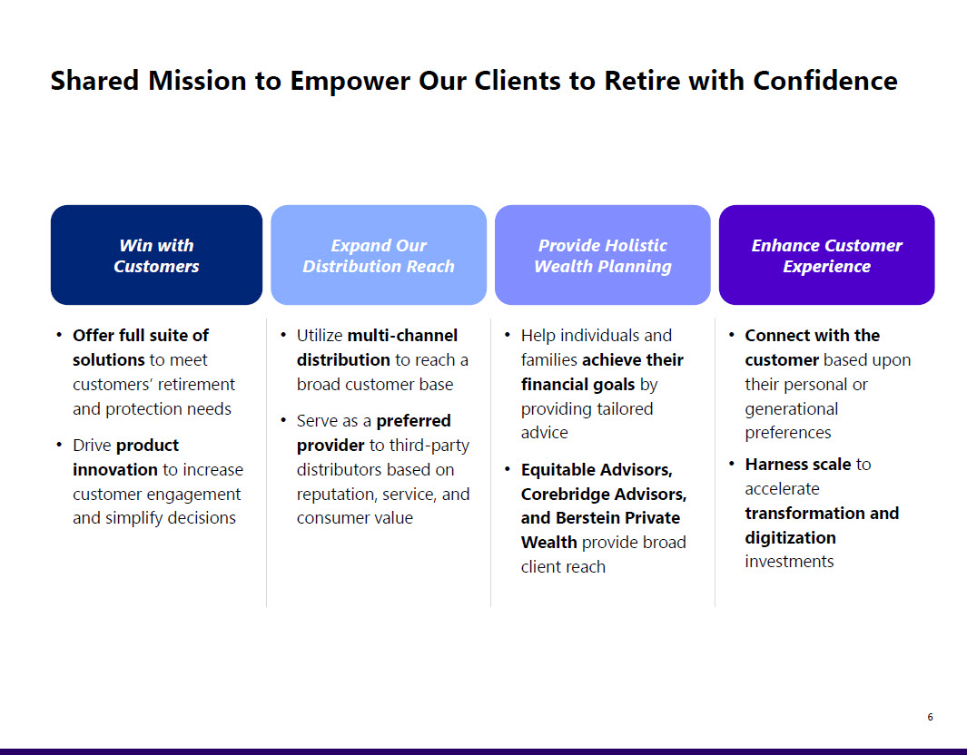 of this line 6 Shared Mission to Empower Our Clients to Retire with Confidence Win with Customers • Offer full suite of solutions to meet customers’ retirement and protection needs • Drive product innovation to increase customer engagement and simplify decisions Expand Our Distribution Reach • Utilize multi - channel distribution to reach a broad customer base • Serve as a preferred provider to third - party distributors based on reputation, service, and consumer value Provide Holistic Wealth Planning • Help individuals and families achieve their financial goals by providing tailored advice • Equitable Advisors, Corebridge Advisors, and Berstein Private Wealth provide broad client reach Enhance Customer Experience • Connect with the customer based upon their personal or generational preferences • Harness scale to accelerate transformation and digitization investments
